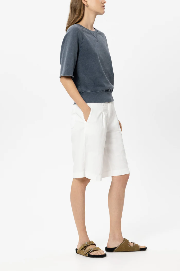 Bluza z krótkim rękawem wykonana z czystej bawełny w subtelnym malowanym stylu tinto z prążkowanym okrągłym dekoltem i opadającymi ramionami. Krótkie rękawy zakończone są podwiniętym dołem.