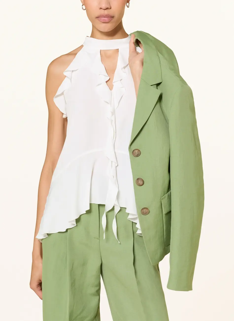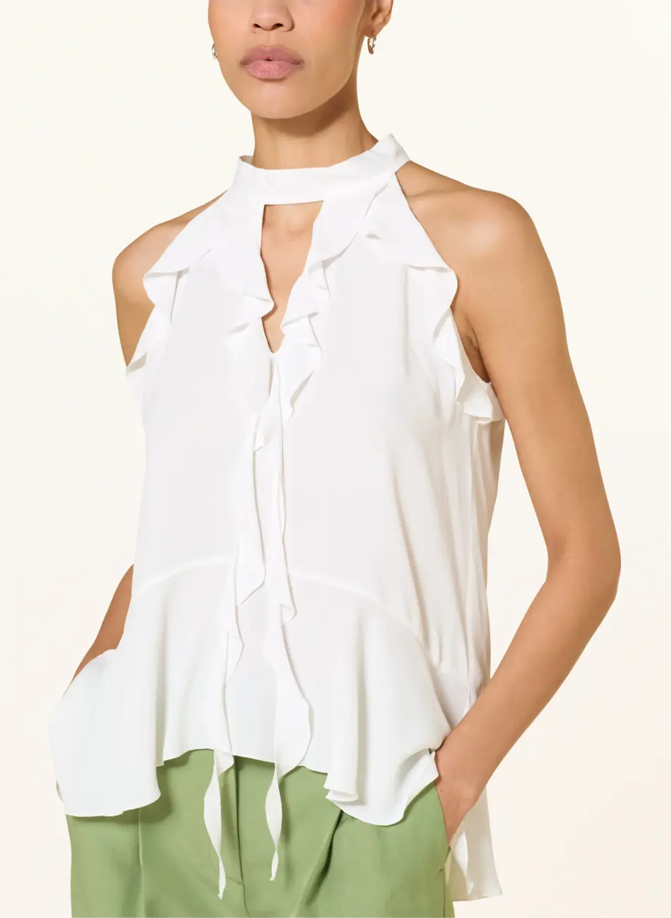 Kobieca, figlarna, lekko rozkloszowana bluzka z lejącej mieszanki jedwabiu z dekoltem w szpic, wyrafinowanymi falbanami boho i peplumem. Ramiączka typu halterneck są wiązane z tyłu jak krawat.