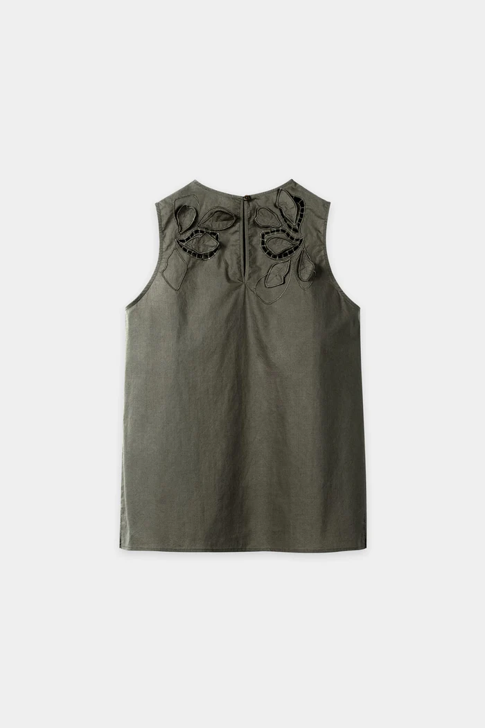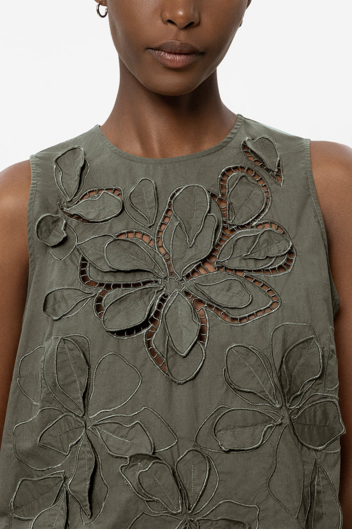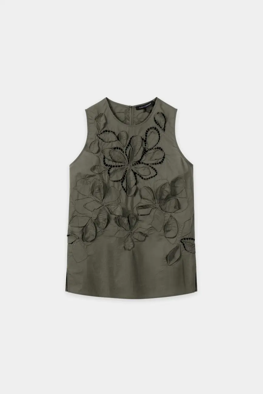 Lekka, kobieca bluzka z misternym haftem oczkowym i kwiatowymi aplikacjami. Bluzka ma lekko rozkloszowany krój, okrągły dekolt z zapięciem na guziki z tyłu i małe boczne rozcięcia na dole.