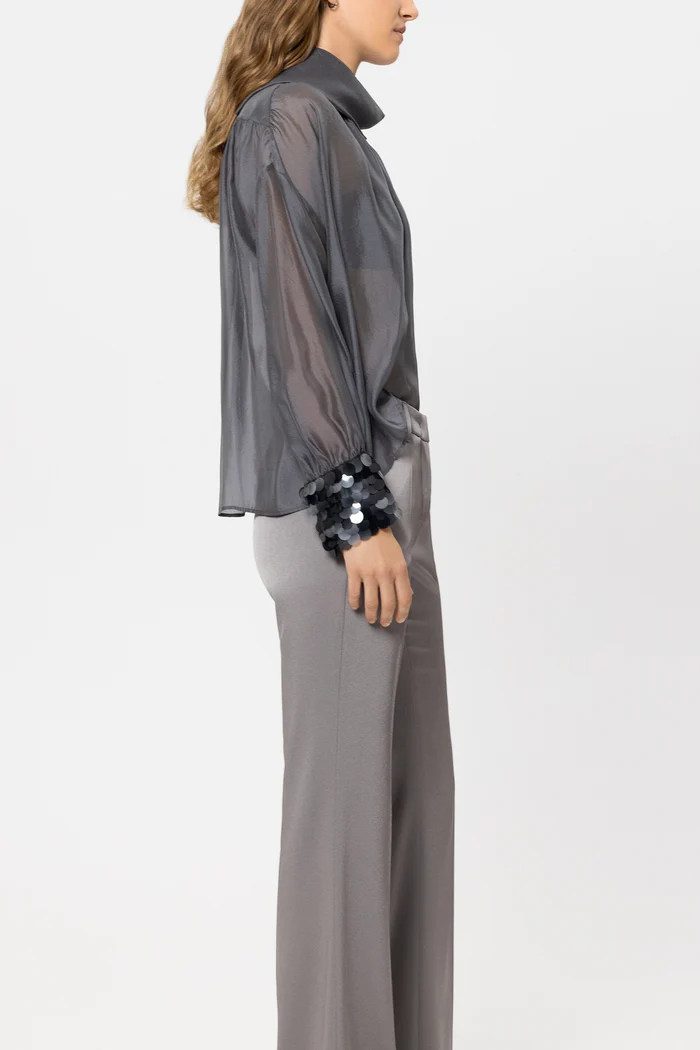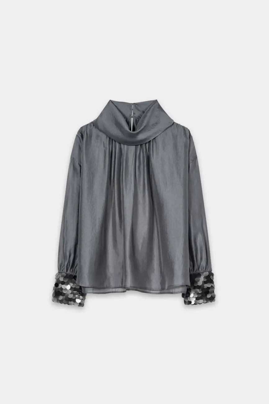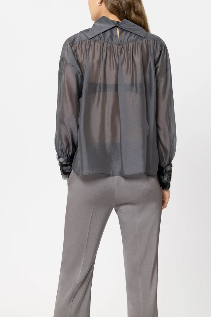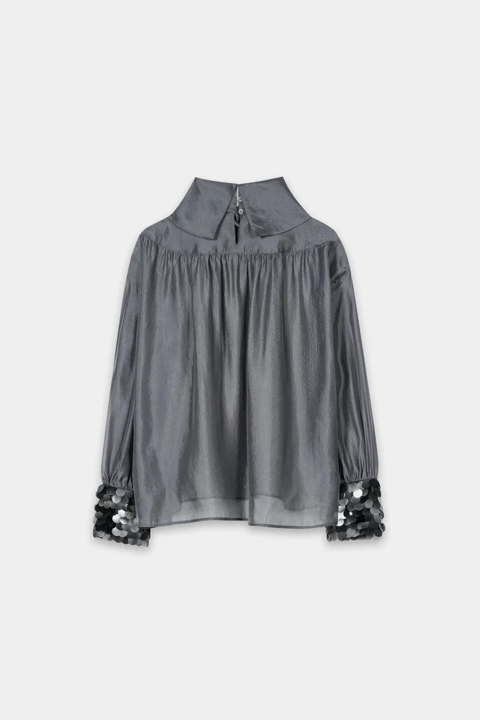 Bluzka-tunika Luisa Cerano z długim rękawem, wykonana z półprzezroczystej krepy wiskozowej, o luźnym kroju i marszczeniach. Szeroki kołnierzyk zapinany jest na guziki. Mankiety rękawów zdobią duże cekiny.