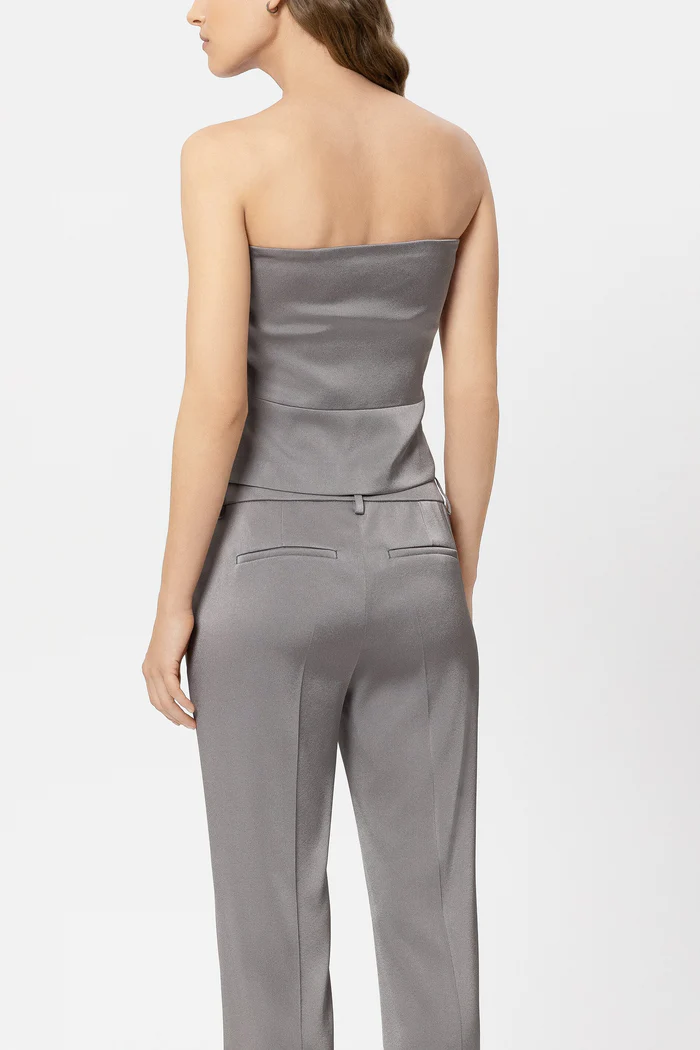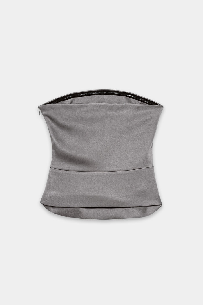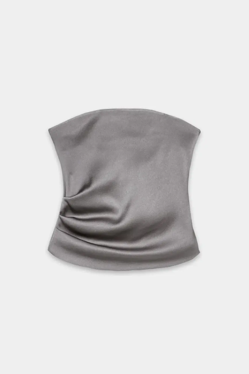 Gorset bez rękawów wykonany z krepy triacetowej z połyskującą satyną na zewnątrz i kobiecym marszczeniem po bokach. Silikonowa powłoka na górze, elastyczna taśma pod biustem od wewnątrz i zamek błyskawiczny z boku zapewniają bezpieczne dopasowanie bez zsuwania się.