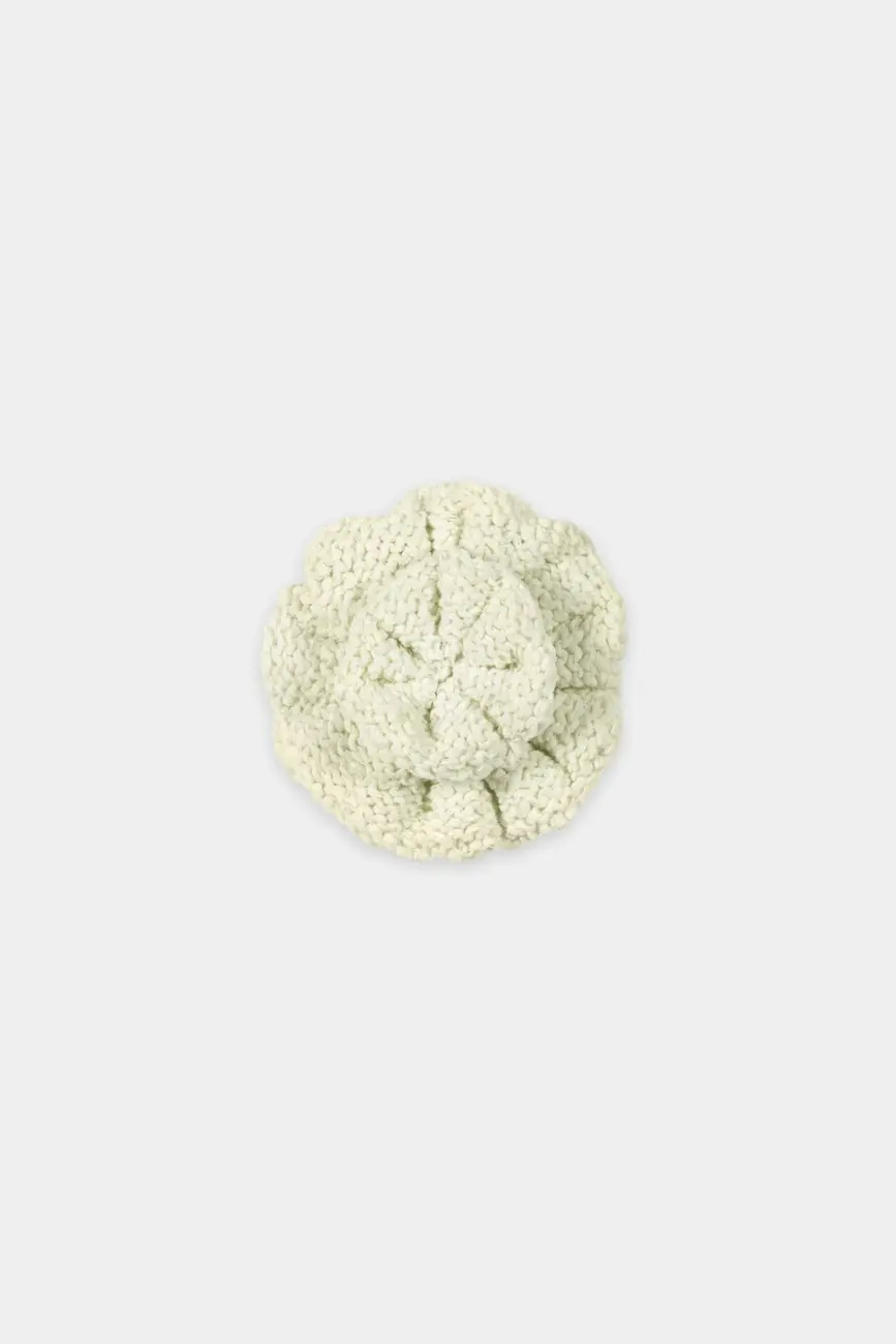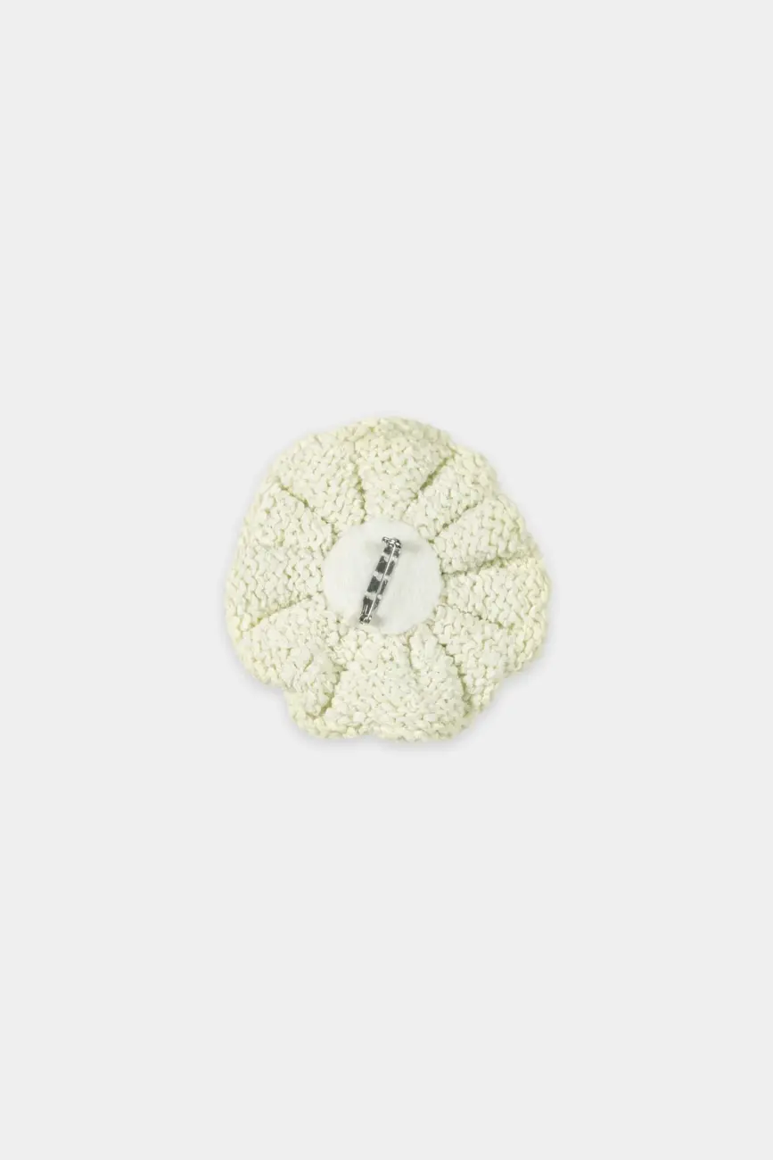Broszka w kształcie kwiatu z agrafką z tyłu. Broszka jest wykonana z letniej przędzy o fakturze przypominającej papier.