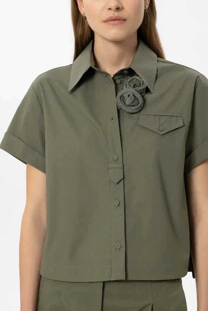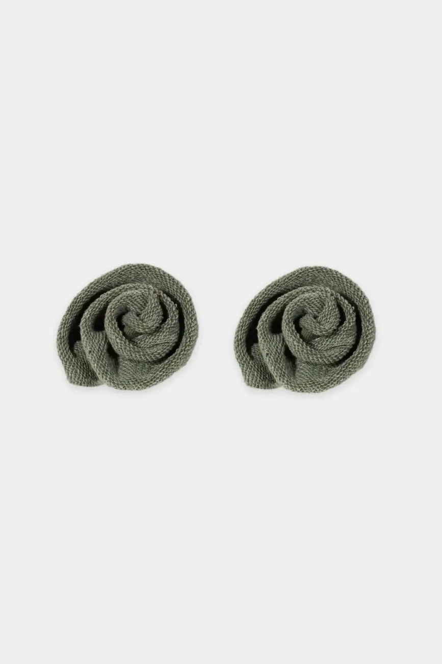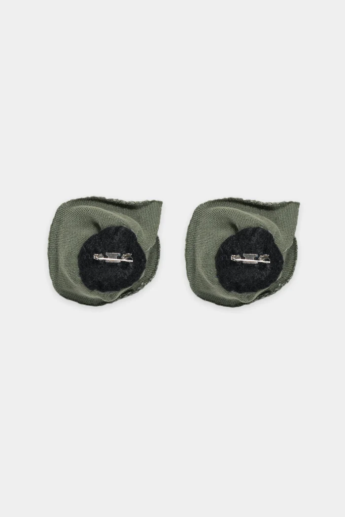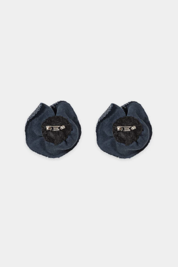 Broszka wykonana z materiału tekstylnego w kształcie ozdobnej róży. Z tyłu przymocowana jest agrafka.