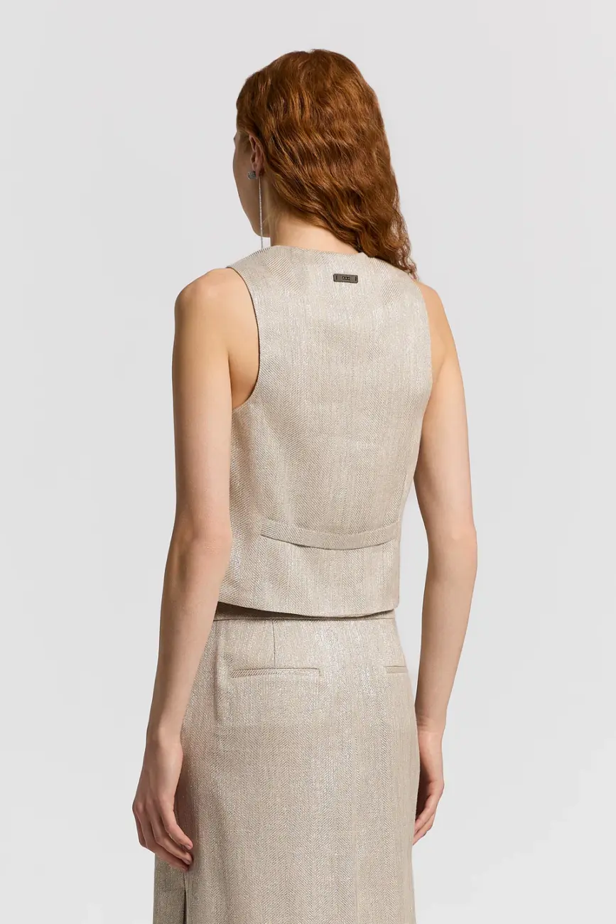 Elegancka kamizelka z mieszanki lnu i wiskozy o jodełkowym splocie, subtelnie rozświetlona srebrnymi refleksami lamé. Jednorzędowy model z wyraźnym dekoltem w kształcie litery V podkreśla sylwetkę dopasowanym krojem. Lamówki przy dekolcie i zapięciu akcentują precyzyjną linię, a cztery widoczne guziki nadają całości klasyczny charakter. Z tyłu pasek martingale z detalem Punto Luce dodaje świetlistego, charakterystycznego wykończenia. Model w pełni na podszewce.