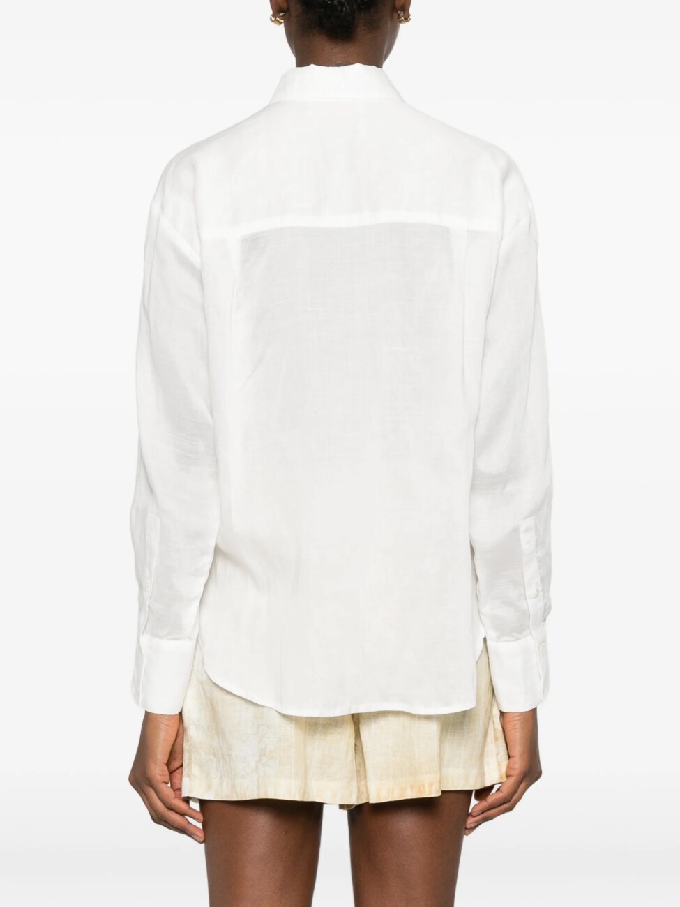 Elegancka, lekka koszula w kolorze złamanej bieli, wykonana z delikatnej, lekko prześwitującej tkaniny. Model ma klasyczny kołnierzyk i zapięcie na guziki na całej długości. Przód zdobią symetryczne, dekoracyjne hafty w odcieniu kremowym o roślinnym, ornamentowym wzorze, które nadają całości subtelnie romantycznego i artystycznego charakteru.