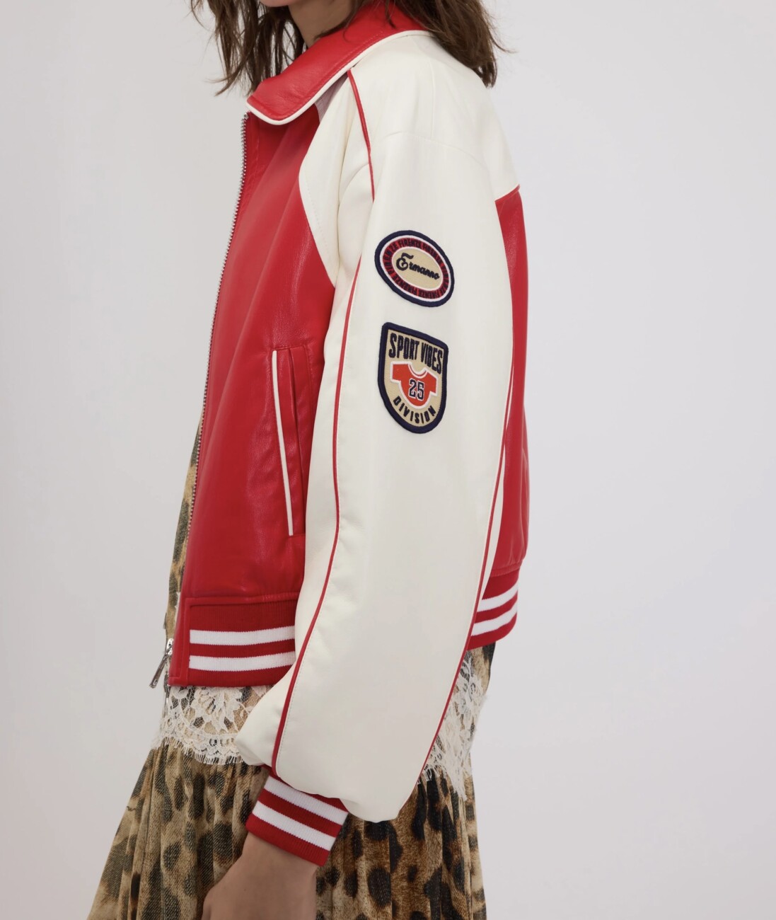 Kurtka bomberka z dwukolorowego materiału imitującego skórę, z kołnierzem, kontrastowymi lamówkami oraz prążkowanymi ściągaczami w paski przy mankietach i u dołu. Ozdobiona haftowanymi naszywkami w stylu college. Zapinana na zamek, z kieszeniami typu welt (wpuszczanymi).