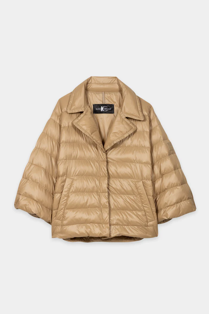 Pikowana kurtka puchowa wykonana z lekkiego nylonu outdoorowego w swobodnym kształcie peleryny z kołnierzem z klapami i szerokimi, skróconymi rękawami. Kurtka ma centralne zapięcie na zatrzaski, dwa boczne rozcięcia z zatrzaskami, regulowany sznurek u dołu, dwie otwarte kieszenie boczne i kieszeń wewnętrzną.