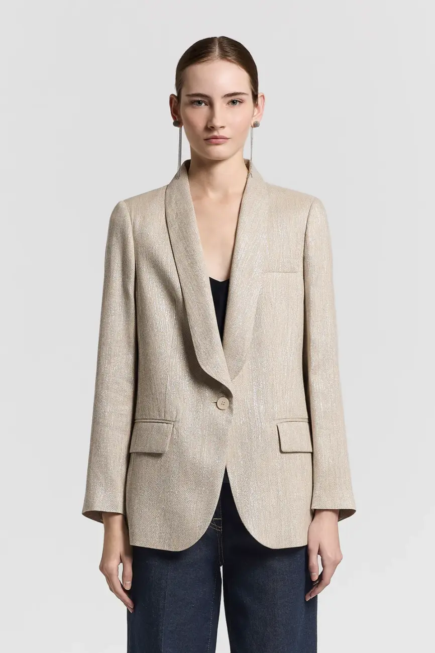 Elegancki damski blazer z lnu i wiskozy w jodełkę ze srebrną nicią lamé. Jednorzędowy krój z szalowym kołnierzem podkreśla płynną linię, a dopasowany fason nadaje sylwetce lekkości. Długie rękawy z guzikami, kieszenie z patkami i zapięcie na guzik dopełniają całość. Model w pełni na podszewce, subtelnie odbija światło.