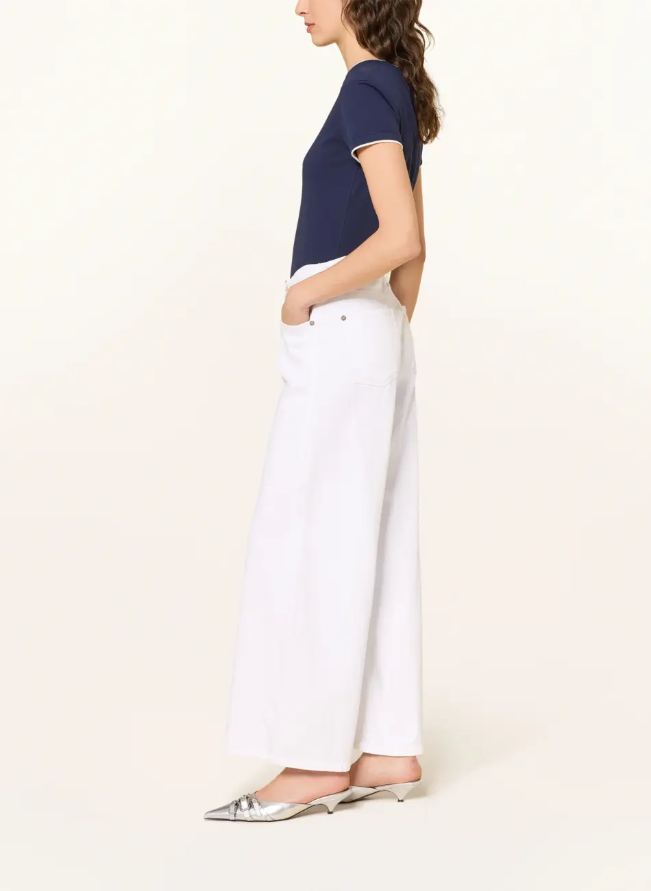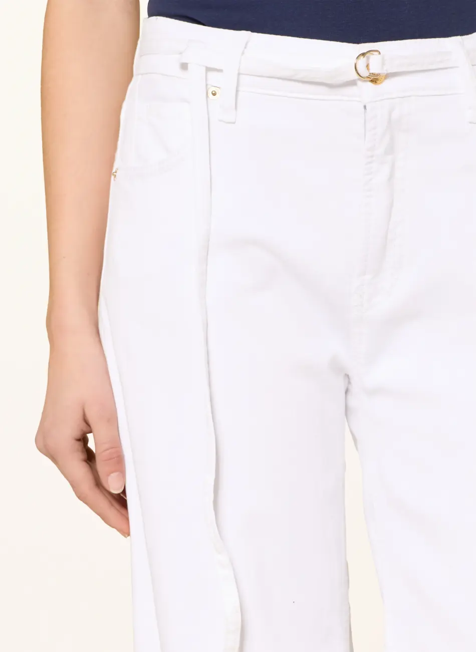 Stylowe jeansy z wysokim stanem i szerokimi, rozszerzanymi nogawkami, które podkreślają sylwetkę i wpisują się w aktualne trendy. Wykonane z denimu z domieszką bawełny, zapewniają wygodę oraz elastyczne dopasowanie. Model wyposażony jest w klasyczny układ 5 kieszeni oraz zapięcie na zamek błyskawiczny. Odpinany pasek pozwala na różnorodne stylizacje, a subtelny detal z logo dodaje całości markowego charakter.