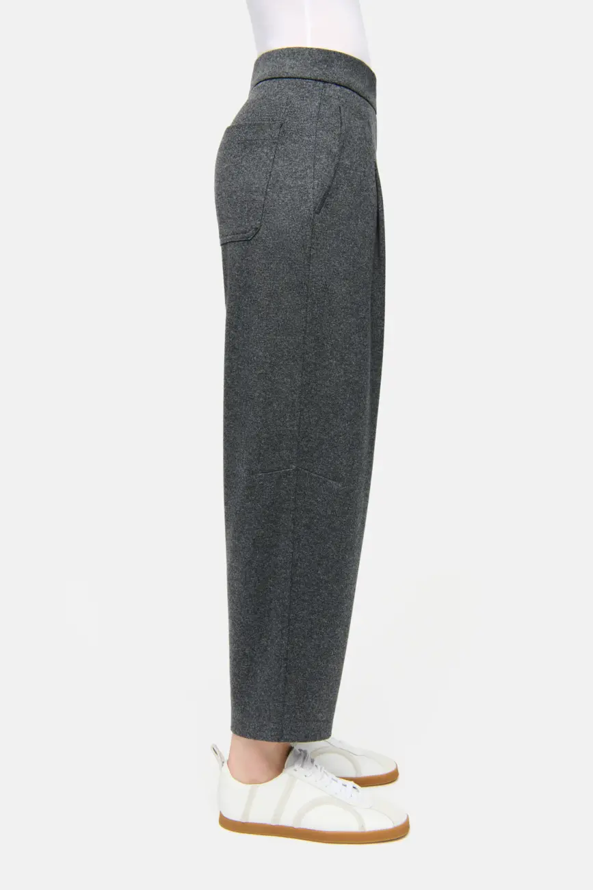 Spodnie OLIVE w kształcie litery O o skróconej długości. OLIVE zachwycają nowoczesnym krojem i wygodą. Wykonane z lekkiej flanelowej dzianiny o wyjątkowo miękkiej fakturze, oferują niezrównany komfort i swobodny krój – idealny do swobodnych, stylowych stylizacji. Elastyczny pas zapewnia wygodne dopasowanie, a plisa i efektowne szwy umiejętnie podkreślają kształt litery O. Kieszenie boczne dopełniają funkcjonalność projektu. Szczególny detal: pojedyncza, swobodnie umieszczona kieszeń tylna – stylowy, dyskretny akcent.
