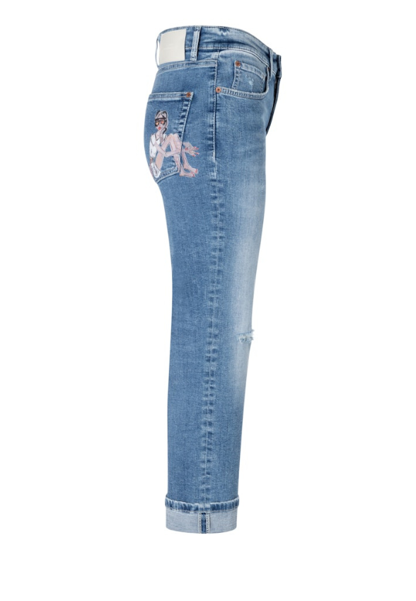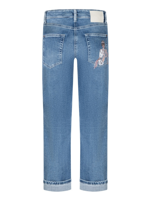 Cambio Gini Straight-fit z nadrukiem. Zapinane na guzik i zamek błyskawiczny, styl five pocket, wykonane z wysokogatunkowego i elastycznego materiału. Jeansy o prostym kroju, subtelne przetarcia, lekko zużyty wygląd, nadruk na tylnej kieszeni.