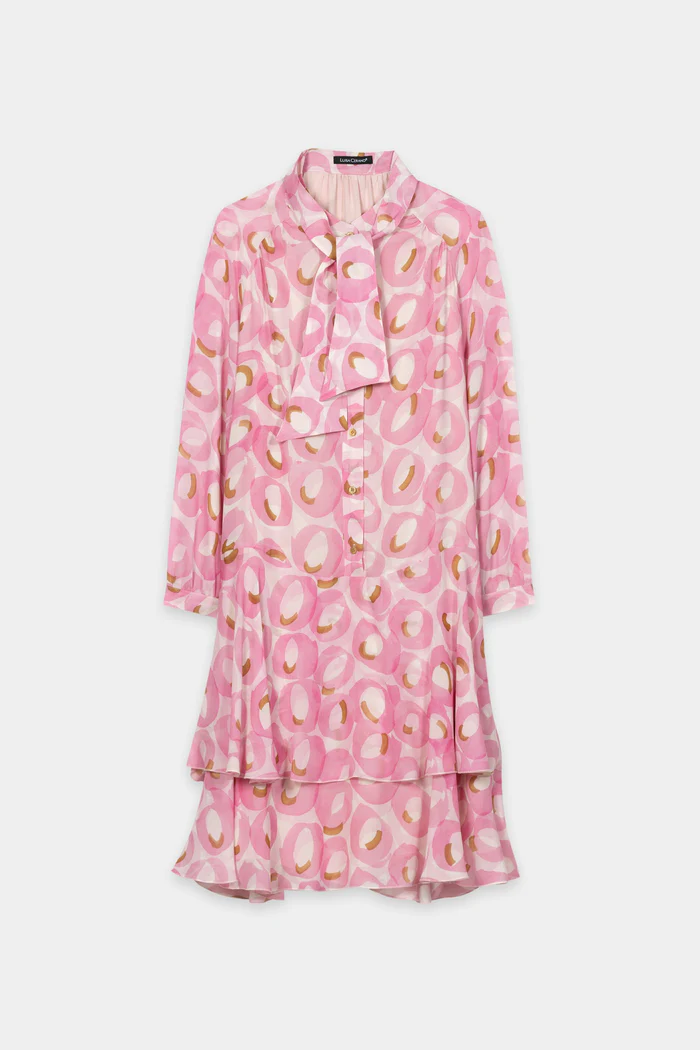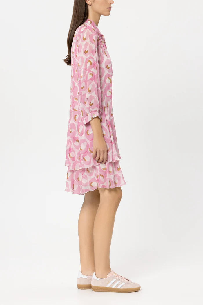Sukienka Luisa Cerano boho o krótkim, kobiecym, rozkloszowanym kroju w stylu retro z półprzezroczystej krepy wiskozowej. Nowoczesną sylwetkę w stylu lat 70. podkreśla patka, rękawy o długości ¾, zapięcie na guziki i lejące falbany u dołu.