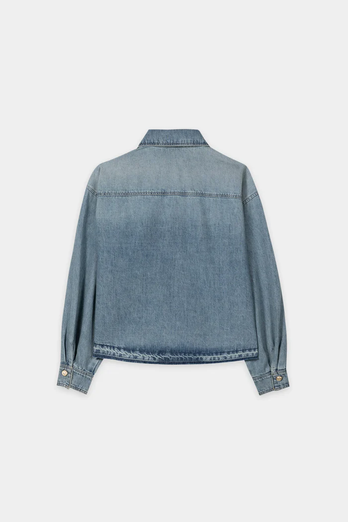 Skrócona koszula o pudełkowym kroju z lekkiego denimowego materiału ze wskazaną kieszenią na piersi i otwartym dołem. Metalowe guziki zdobią mankiety, klapę i zapięcie na guziki. Tył jest zaokrąglony i nieco dłuższy.