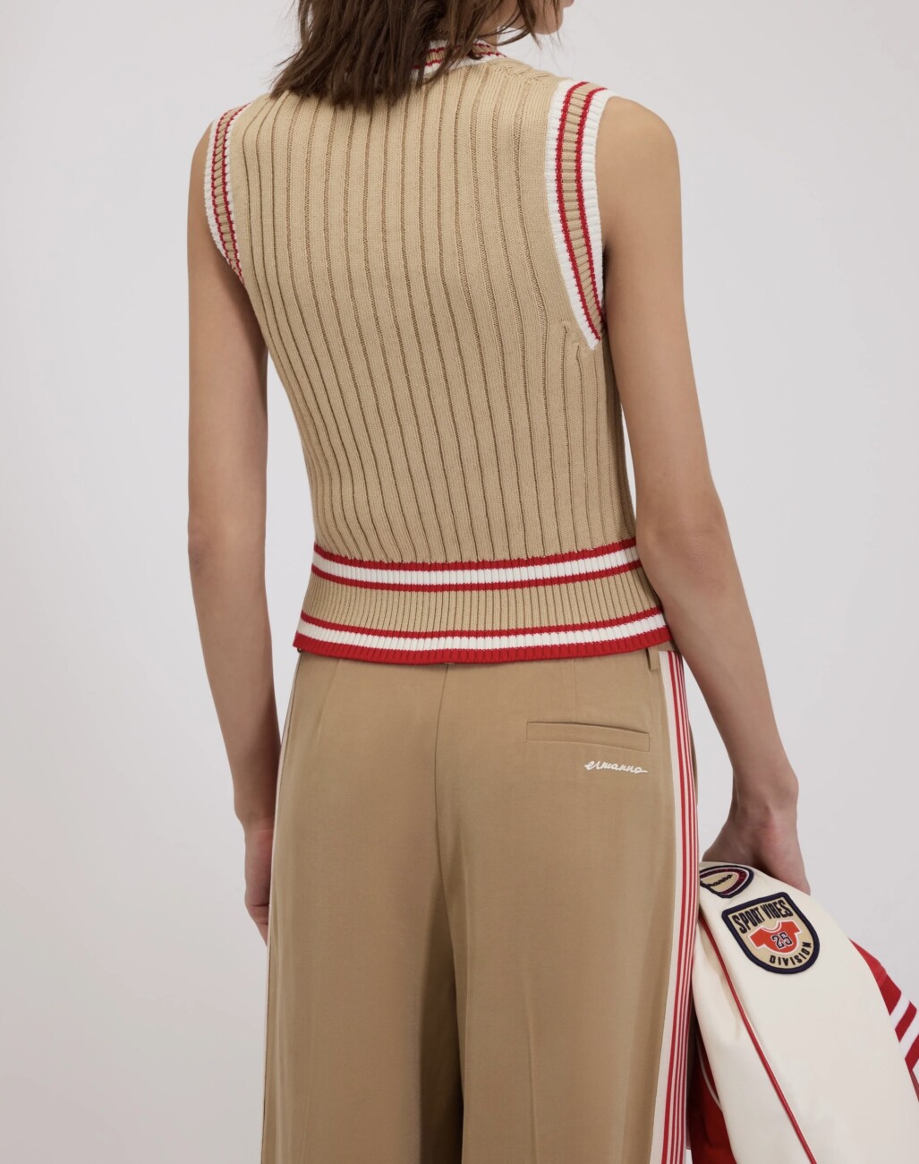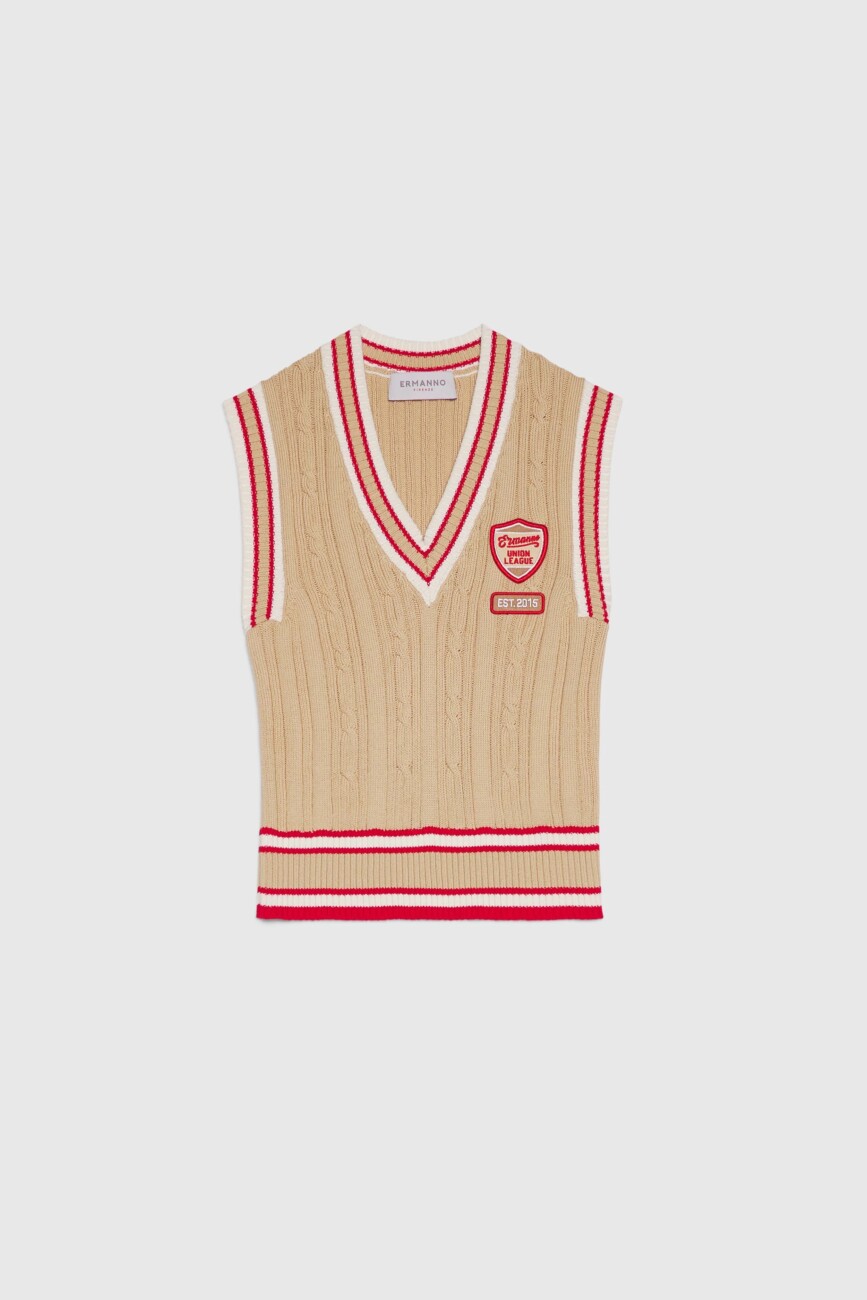 Bawełniana kamizelka o splocie warkoczowym z szerokim dekoltem w kształcie litery V oraz prążkowanymi wykończeniami w paski.