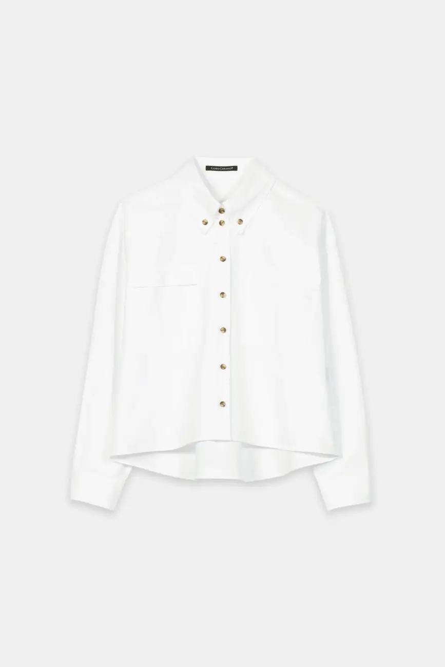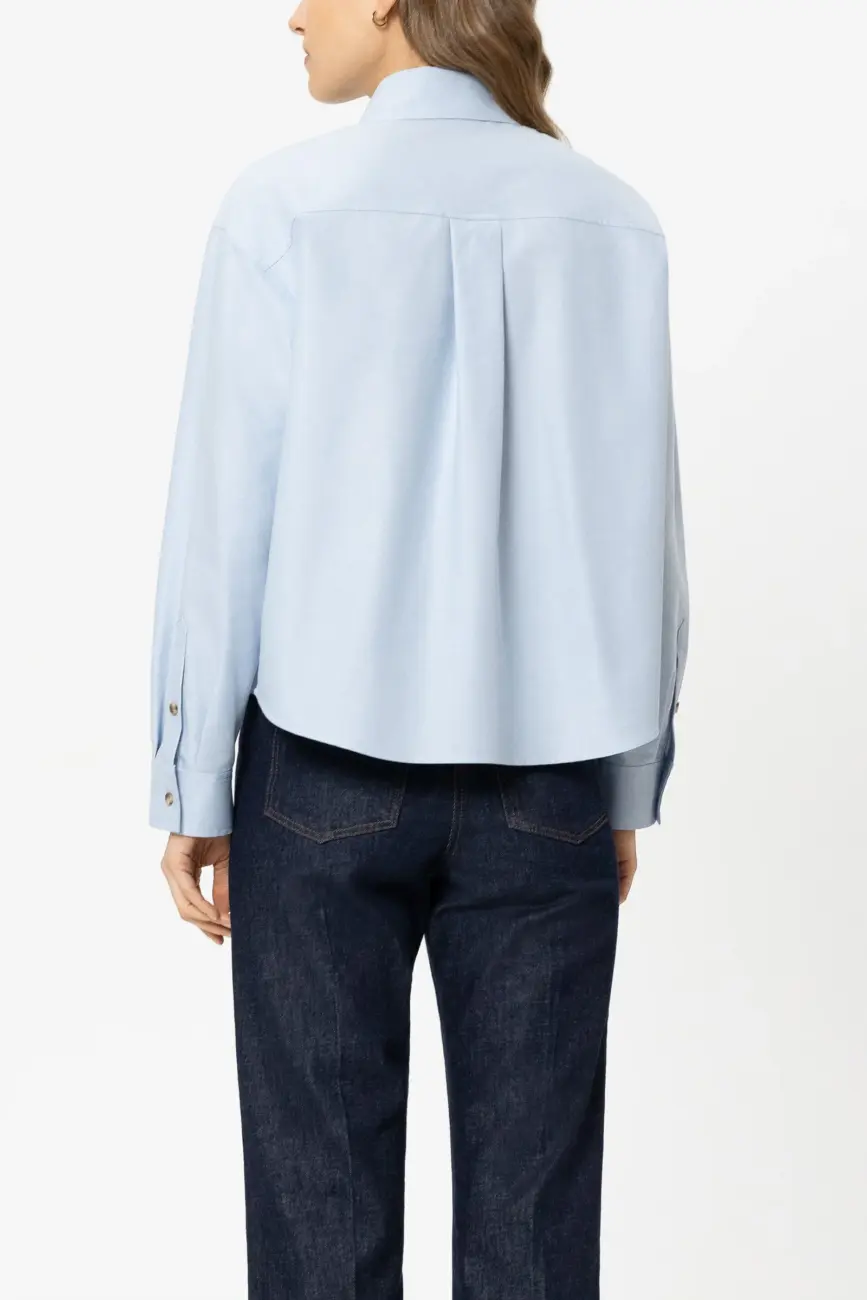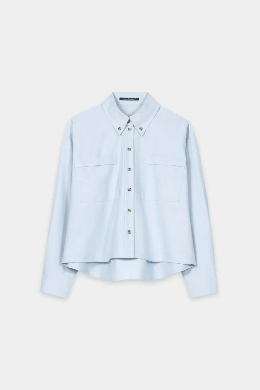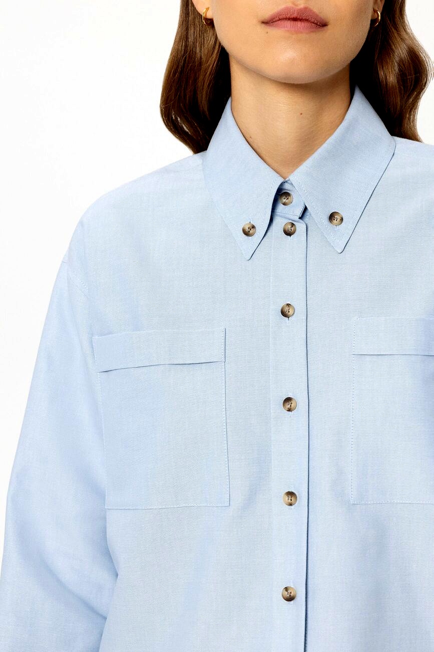 Szeroka, bawełniana bluzka koszulowa z wysokiej jakości tkaniny Oxford. Bluzka ma klasyczny design ze sportowym kołnierzykiem zapinanym na guziki, zapięciem na guziki i dwiema naszywanymi kieszeniami na piersi.