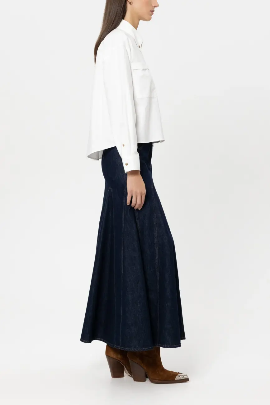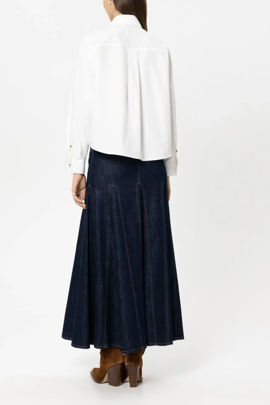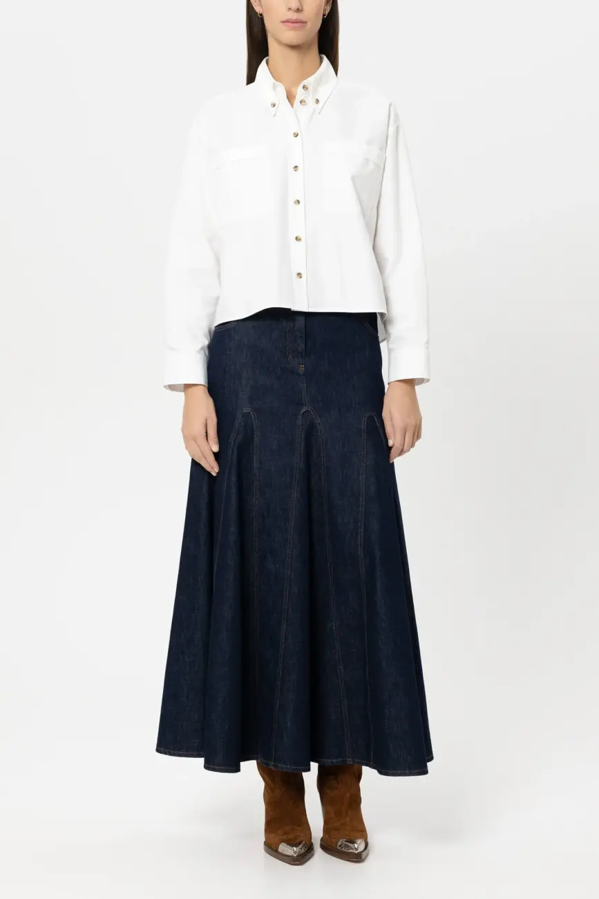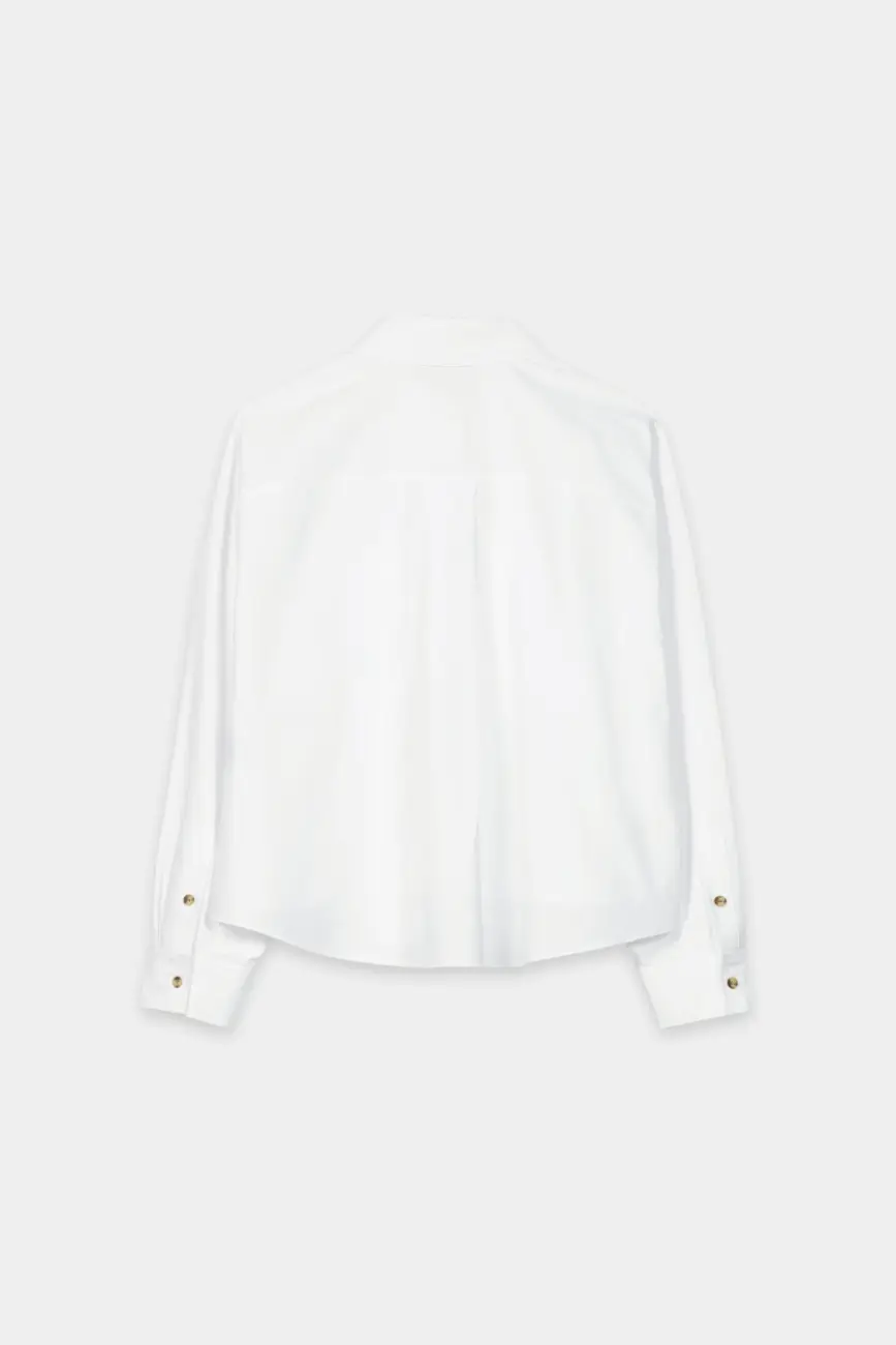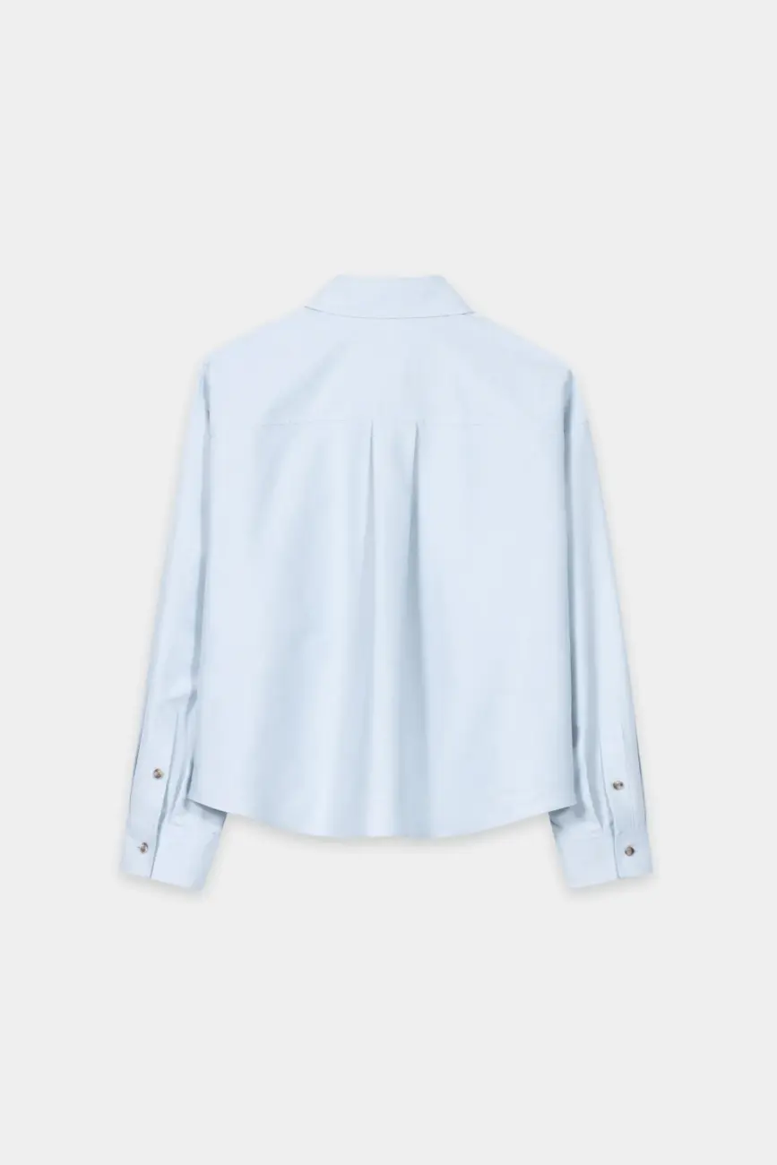 Szeroka, bawełniana bluzka koszulowa z wysokiej jakości tkaniny Oxford. Bluzka ma klasyczny design ze sportowym kołnierzykiem zapinanym na guziki, zapięciem na guziki i dwiema naszywanymi kieszeniami na piersi.
