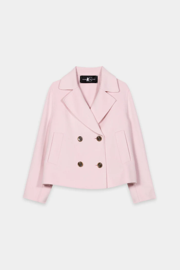 Przycięta kurtka Luisa Cerano wykonana z luksusowej mieszanki wełny i kaszmiru z wyrafinowanym, ręcznie wykonanym wykończeniem o podwójnej powierzchni. Dwurzędowa kurtka zapinana na guziki ma klasyczny kołnierz klapowy i dwie boczne kieszenie.