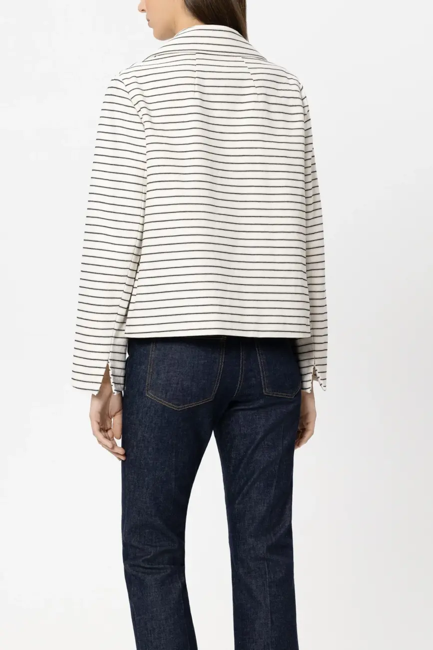 Skrócona, dwurzędowa marynarka typu caban w paski, z szerokimi klapami. Marynarka ma pełną podszewkę i dwie naszywane kieszenie. Rękawy są rozcięte po bokach i można je łatwo podwinąć.