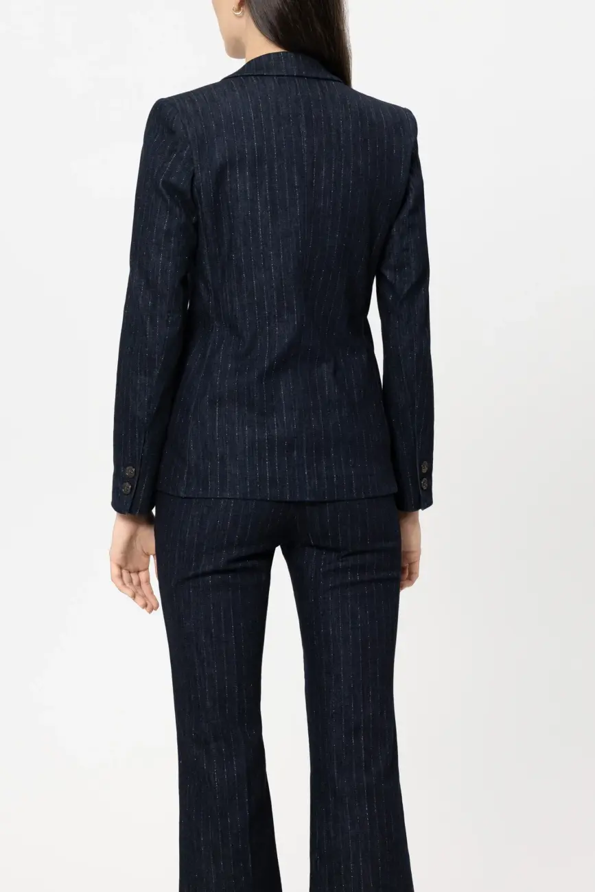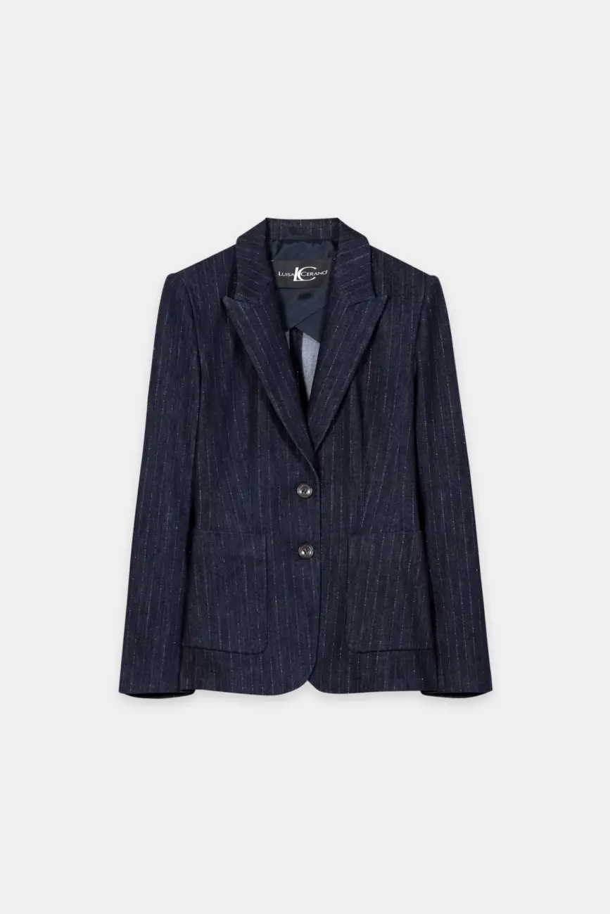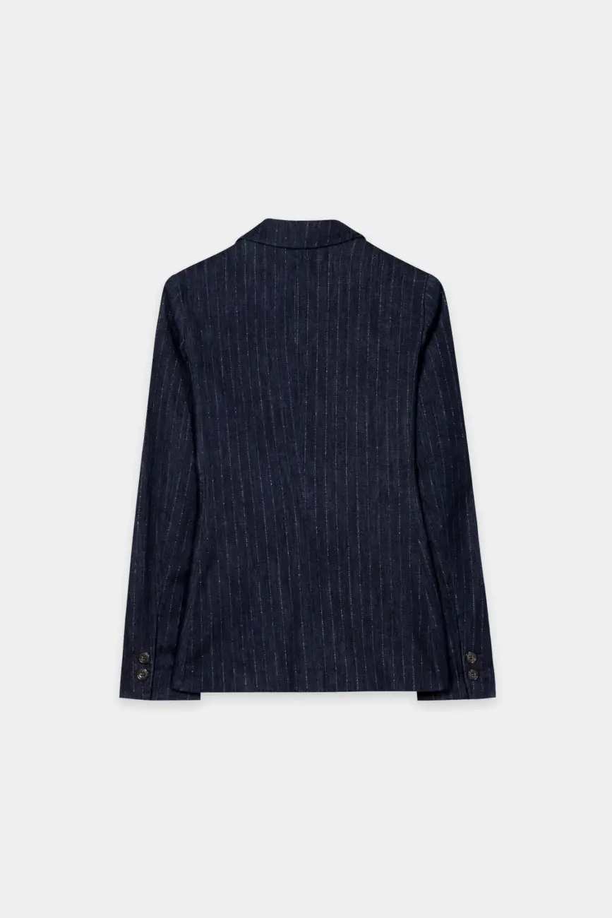 Dopasowana marynarka zapinana na dwa guziki z autentycznego denimu z kołnierzem klapowym, poduszkami na ramionach i dwiema dużymi naszywanymi kieszeniami. Błyszczące prążki przyciągają wzrok i nadają tej sportowej marynarce eleganckiego charakteru.