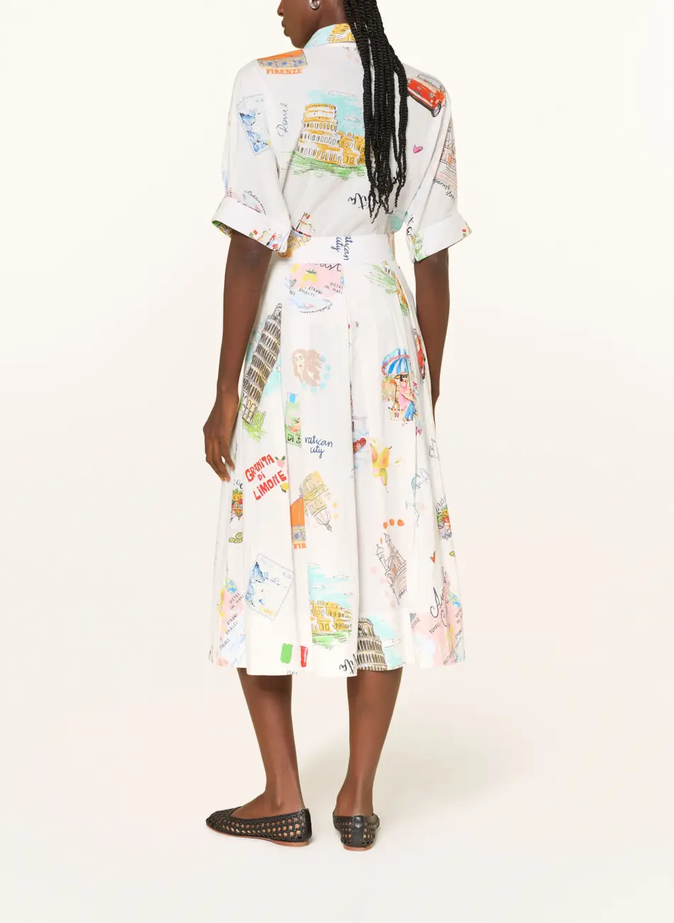 Rozkloszowana spódnica o kobiecym, swobodnym kroju. Model zapinany na dyskretny zamek błyskawiczny w bocznym szwie. Spódnica posiada wpuszczane kieszenie boczne oraz subtelne zakładki w pasie, które pięknie układają się na sylwetce. Wykonana z wysokiej jakości bawełny, przyjemnej i solidnej w dotyku. Materiał pokryty jest wzorem na całej powierzchni. Model bez podszewki - idealny na cieplejsze dni. Produkt wyprodukowany we Włoszech.
