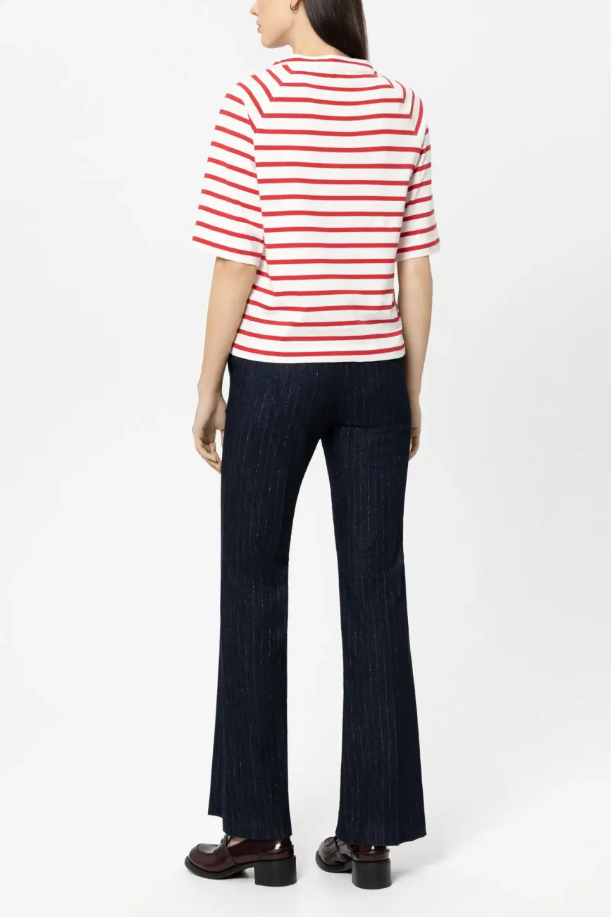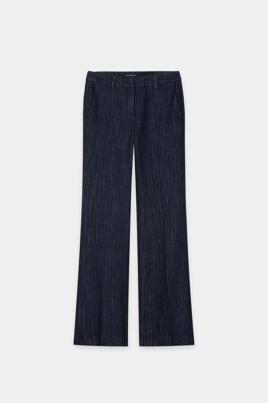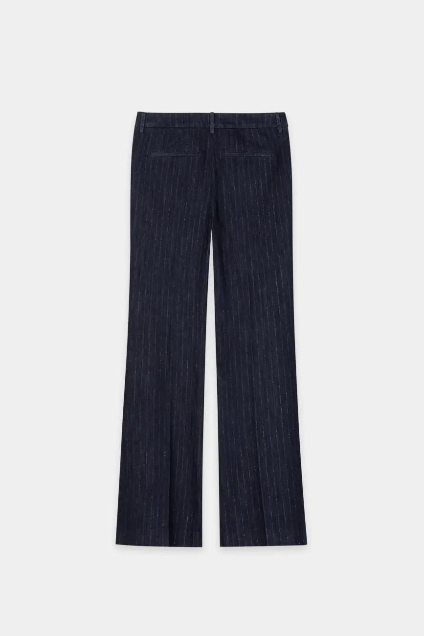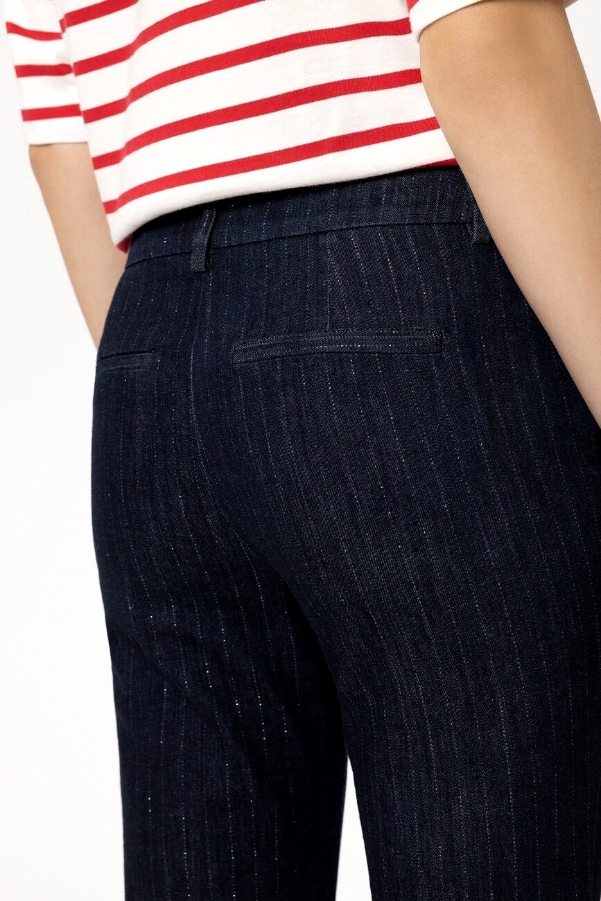 Dżinsy bootleg w kolorze rinse wash z błyszczącymi prążkami. Dwie otwarte kieszenie boczne i dwie fałszywe kieszenie z tyłu dopełniają całości.