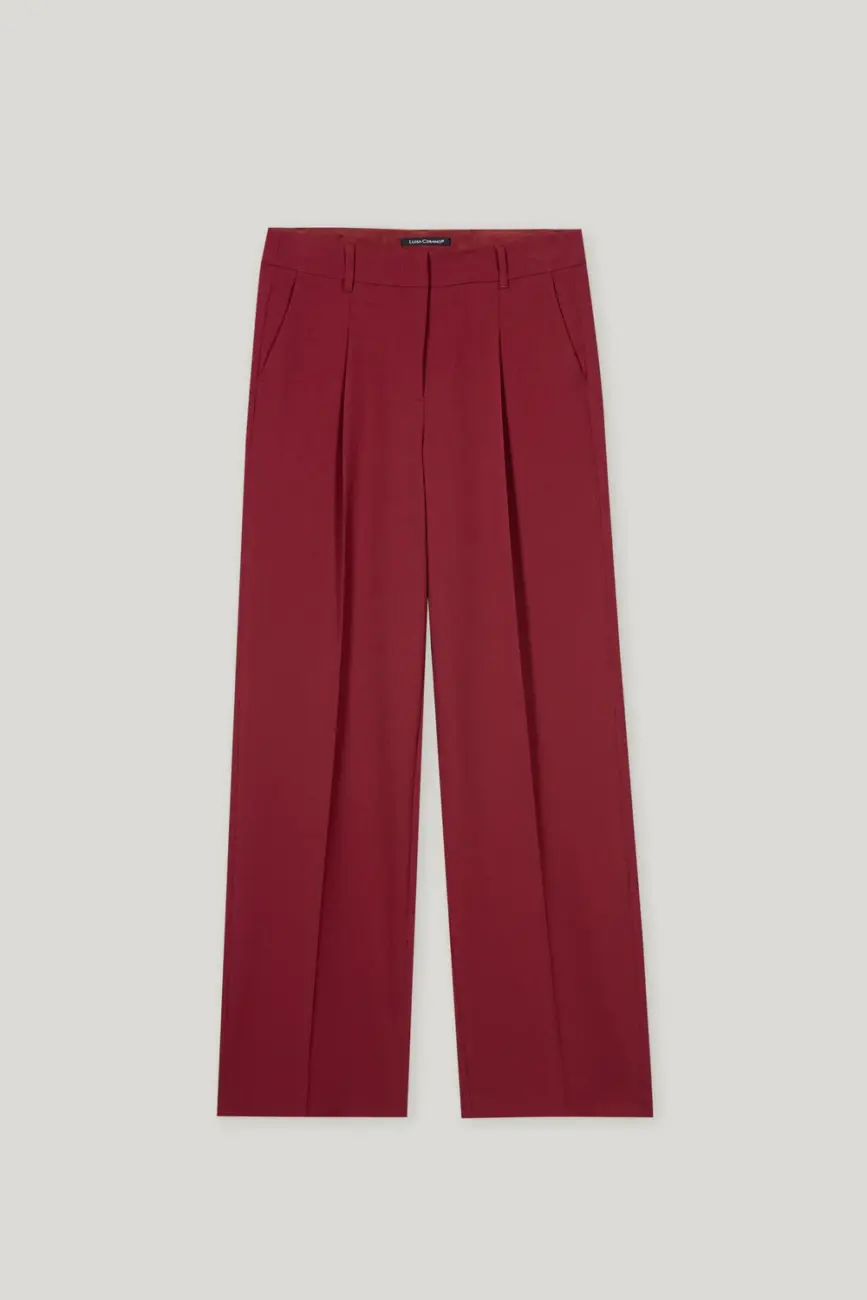 Spodnie Luisa Cerano wykonane z miękkiej techno-wełny z zaakcentowanymi szerokimi nogawkami. Plisy, dwie rozcięte kieszenie i dwie imitacje kieszeni z tyłu dopełniają całości.