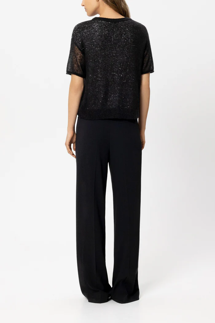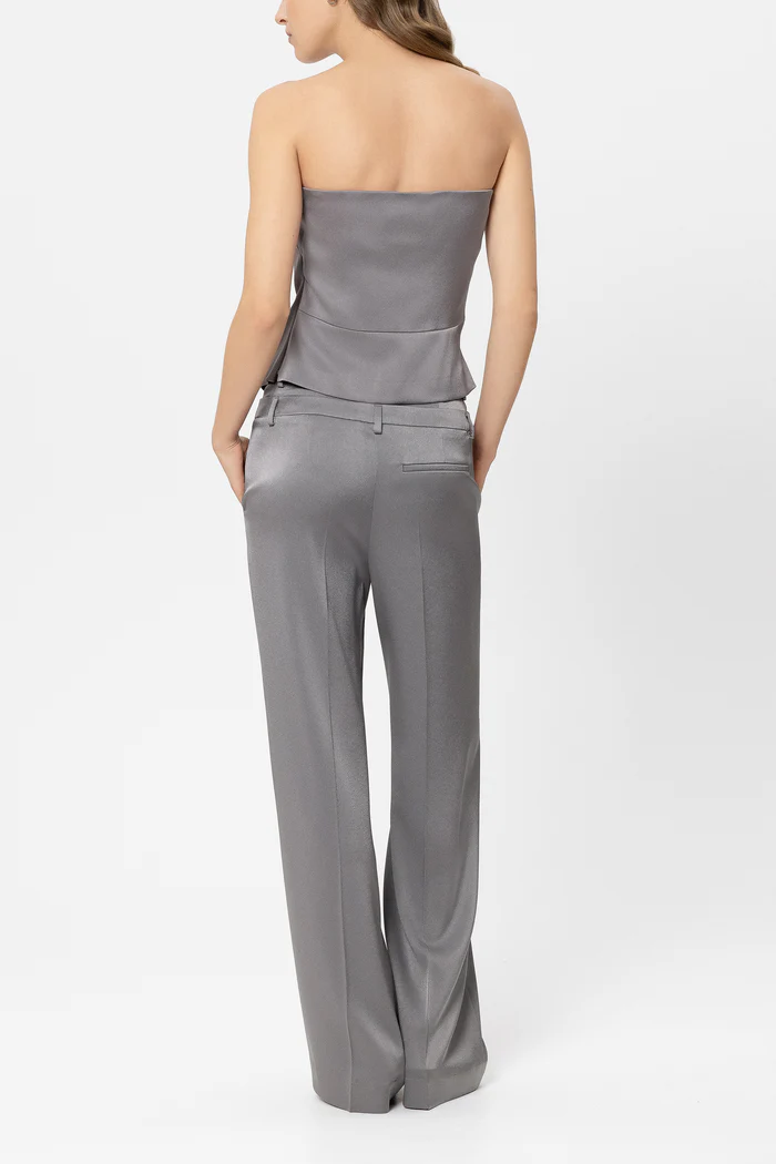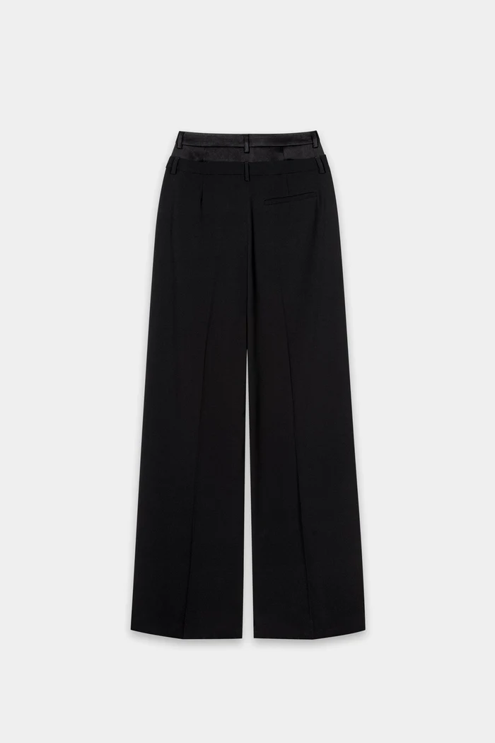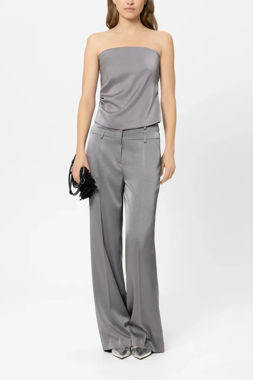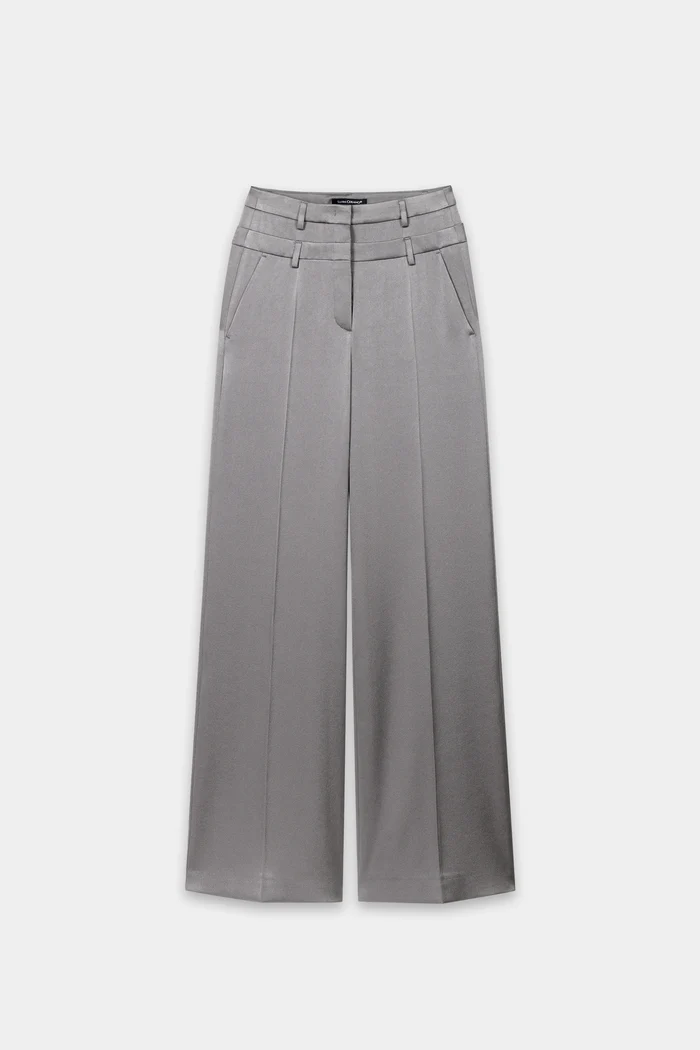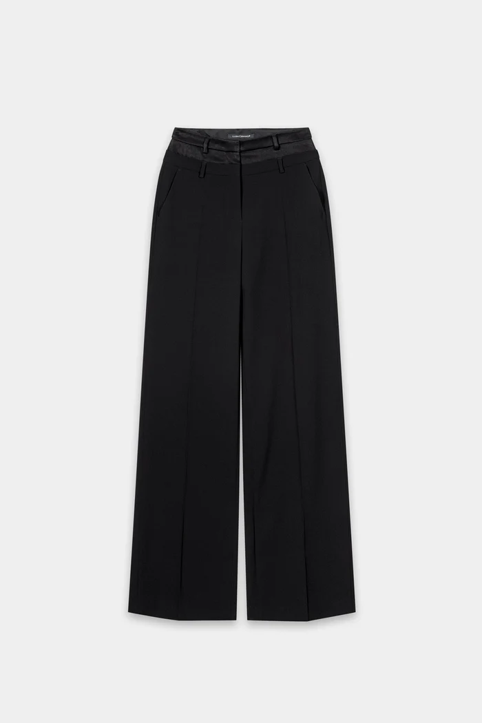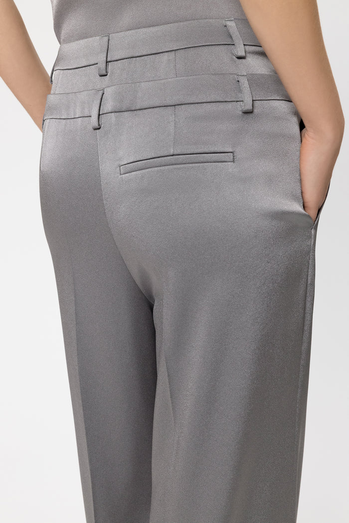 Spodnie Luisa Cerano wykonane z lejącej krepy triacetatowej o matowym wyglądzie z zaakcentowaną szeroką nogawką i zakładkami. Dodatkowy pasek w talii ma kontrastowy satynowy połysk.