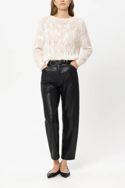 Spodnie Luisa Cerano o przyciętym, beczkowatym kroju wykonane z miękkiej sztucznej skóry. Spodnie mają klasyczny krój z dwiema bocznymi kieszeniami, dwiema tylnymi kieszeniami i szlufkami na pasek.