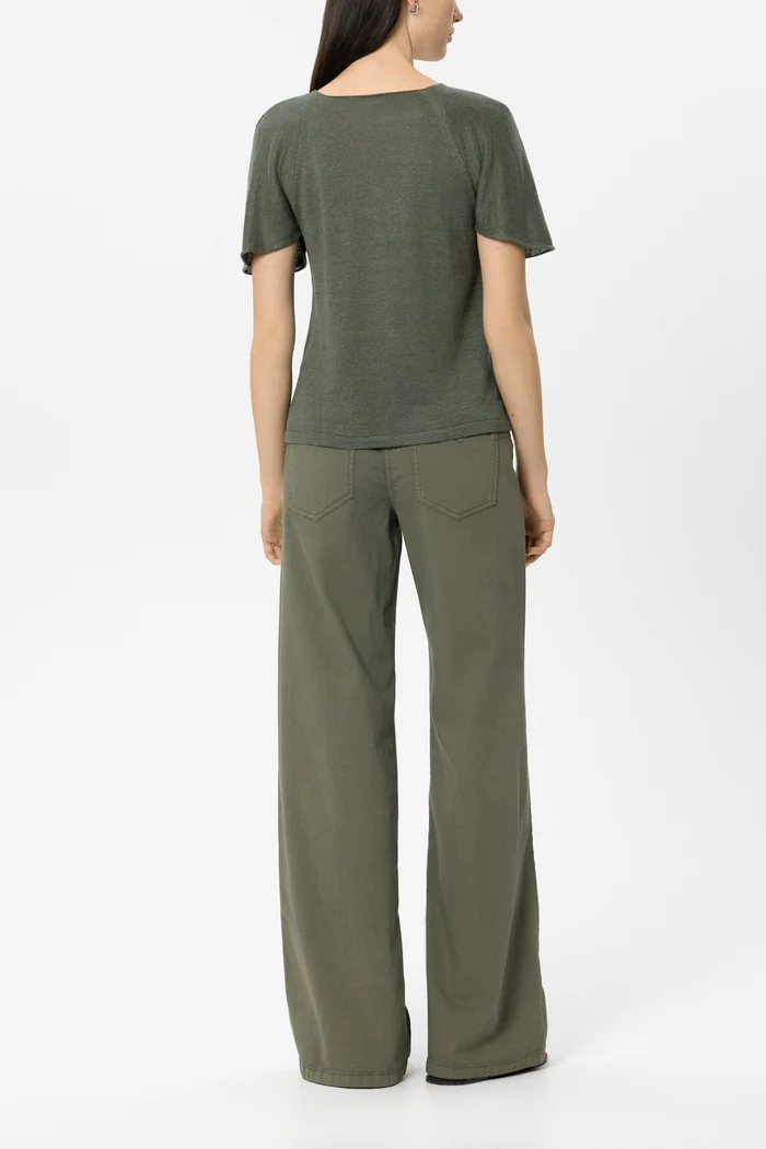 Dżinsy z szerokimi nogawkami wykonane z lekkiego, kolorowego denimu ze stretchem. Te spodnie mają nietypowe detale, takie jak dwie przednie kieszenie z klapkami i ozdobnymi metalowymi guzikami, a także podkreślające figurę przeszycia z tyłu.