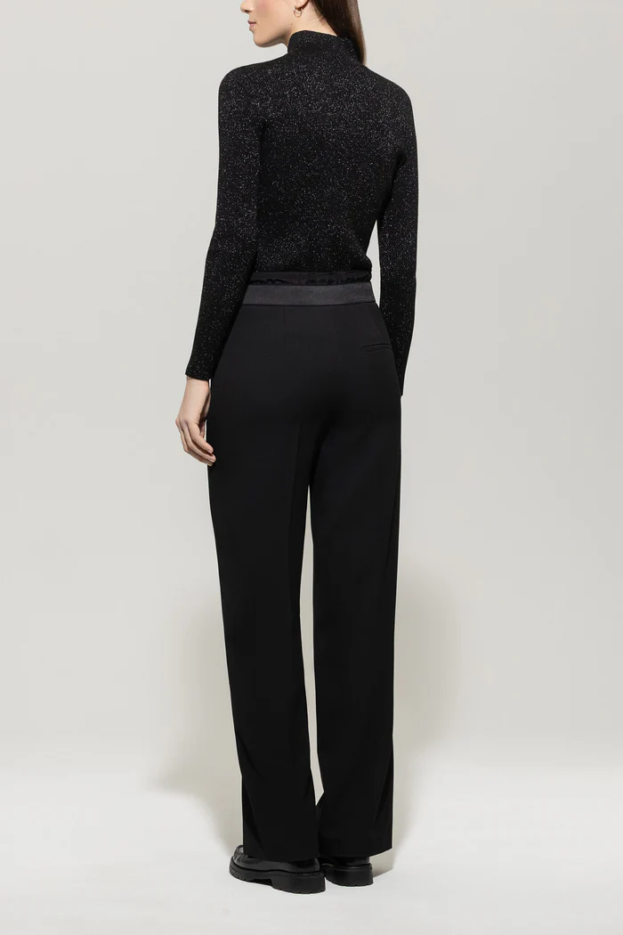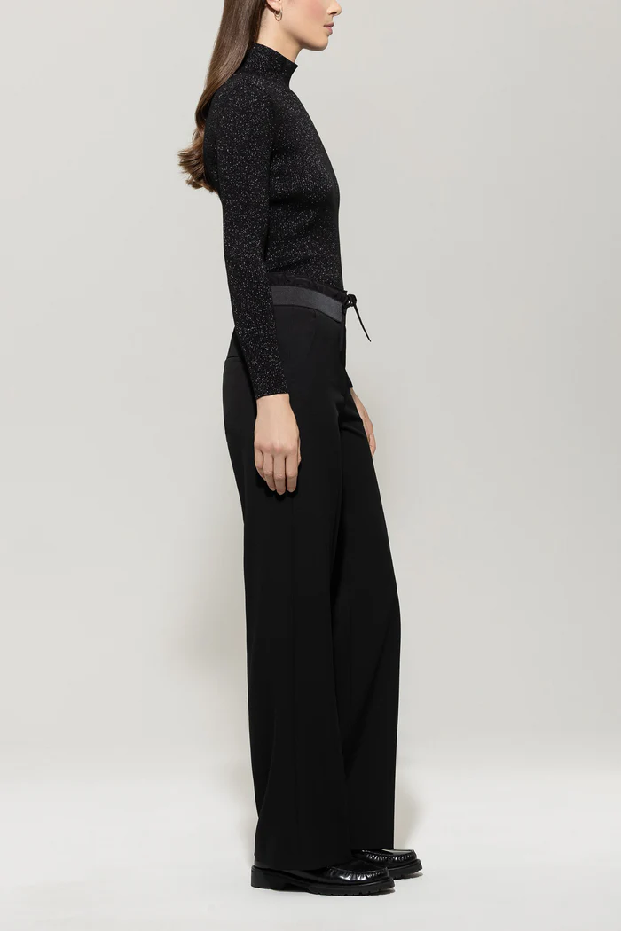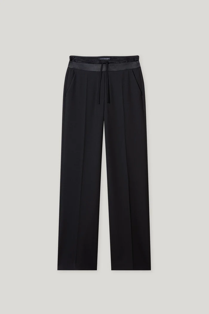 Spodnie Luisa Cerano z szerokimi nogawkami wykonane z miękkiej techno-wełny z marszczeniami, bocznymi rozciętymi kieszeniami i wskazaną tylną kieszenią. Specjalnym detalem spodni jest widoczny elastyczny pas ze sznurkiem.
