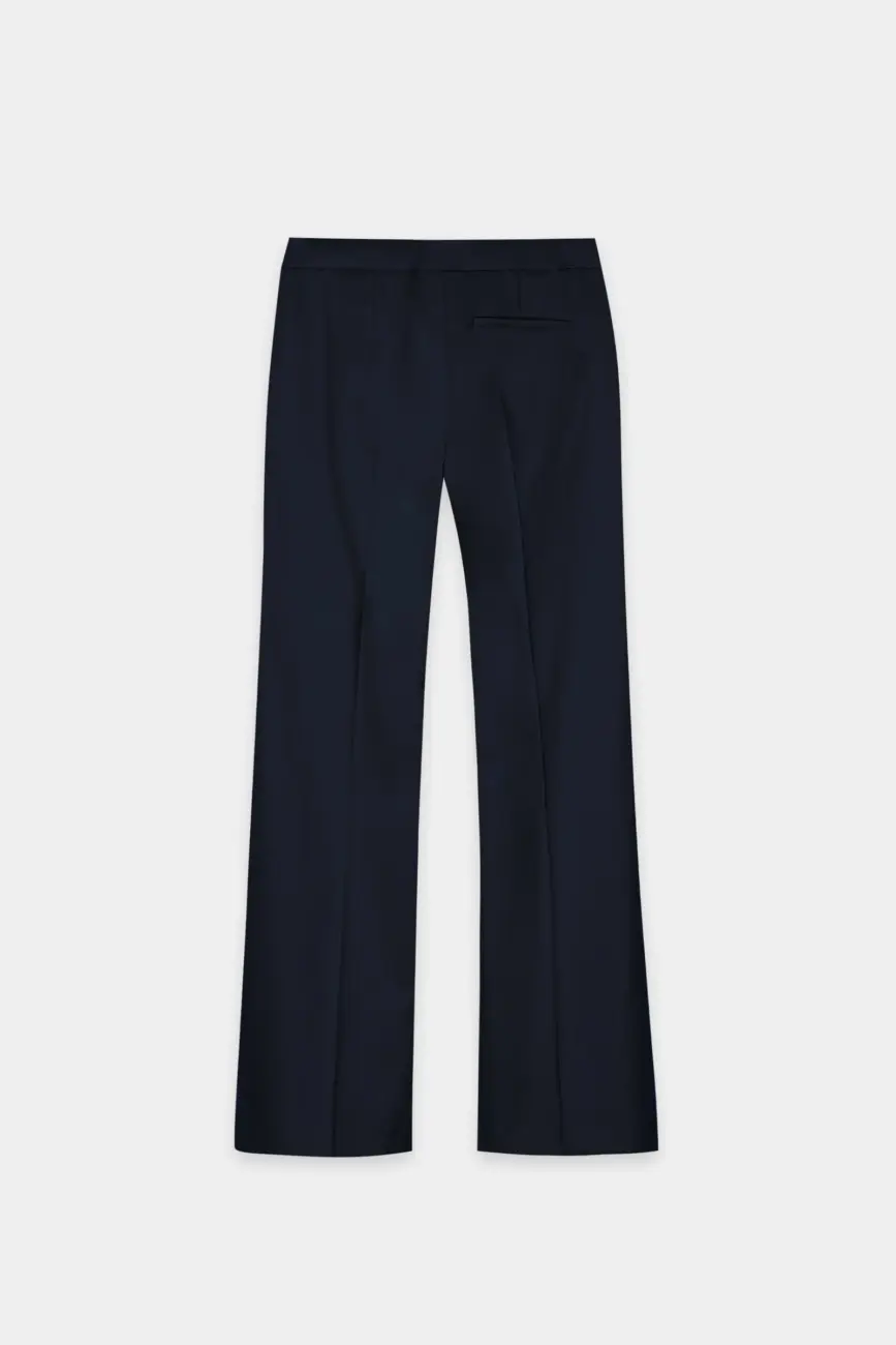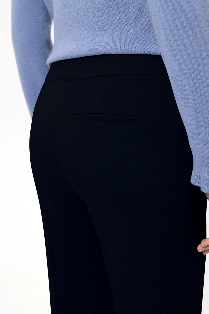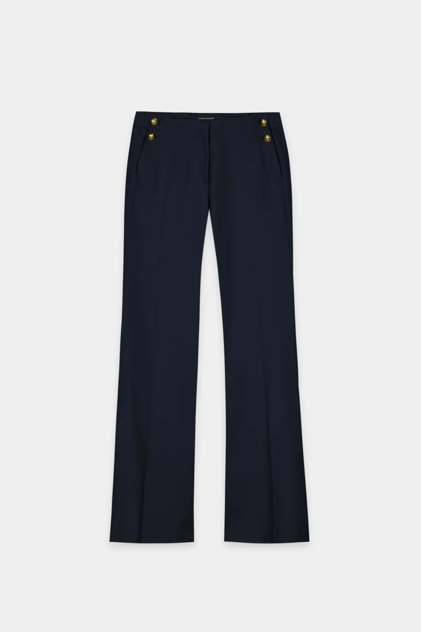 Rozkloszowane spodnie wykonane z elastycznej bawełnianej gabardyny. Spodnie mają ozdobne guziki na bocznych kieszeniach i wskazaną tylną kieszeń.