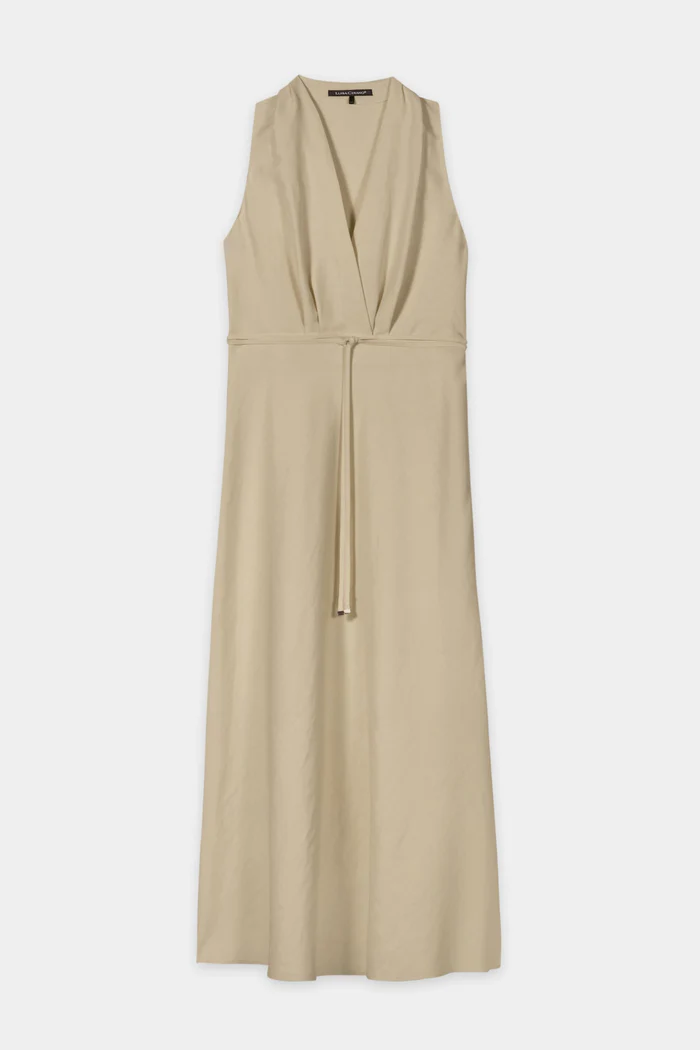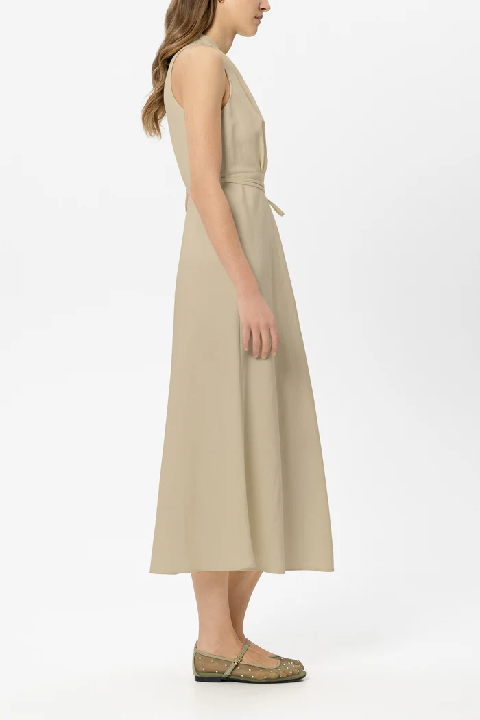 Sukienka bez rękawów z mieszanki lnu z drapowanym dekoltem V i rozkloszowaną spódnicą. Talię podkreśla wąski, wiązany pasek.