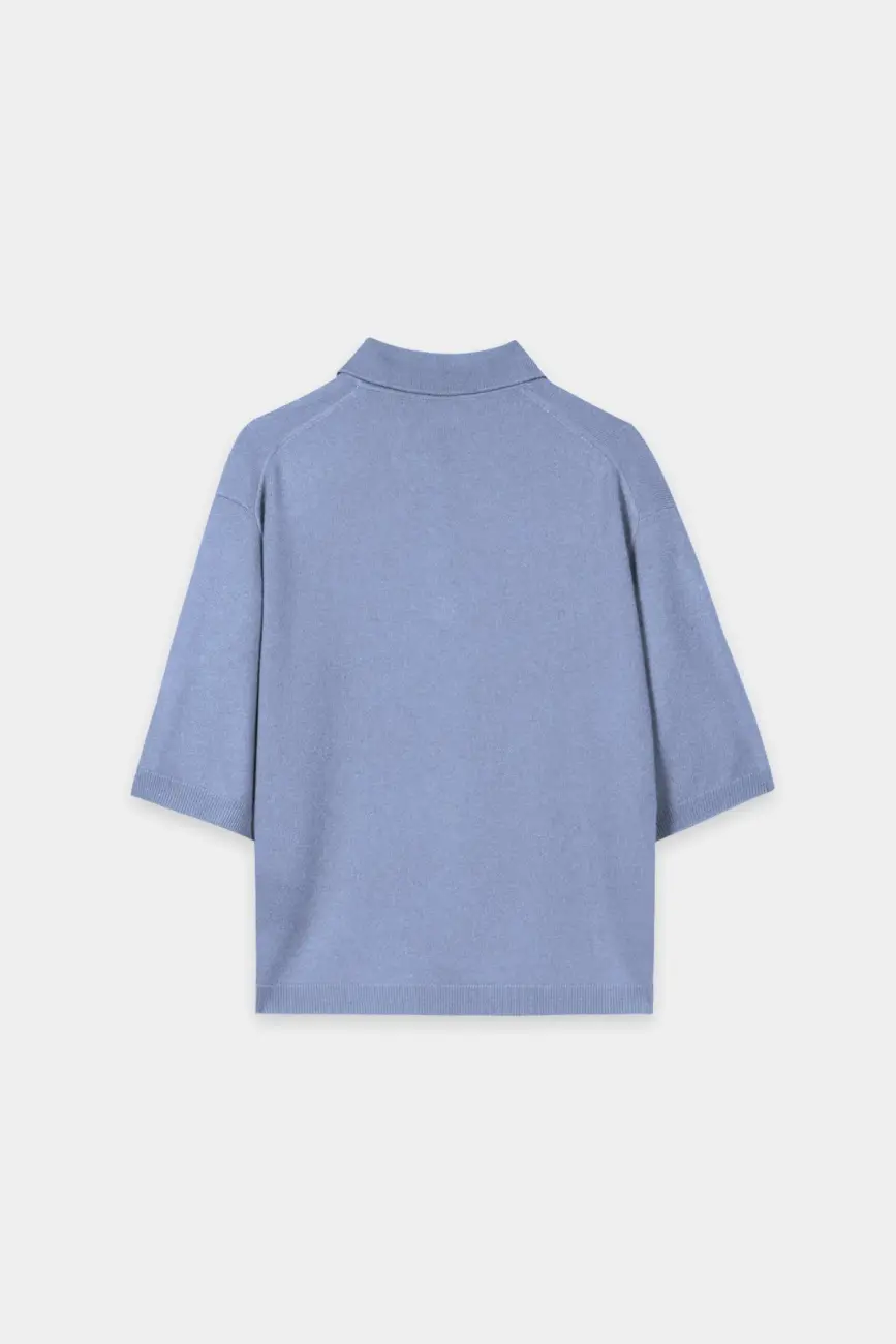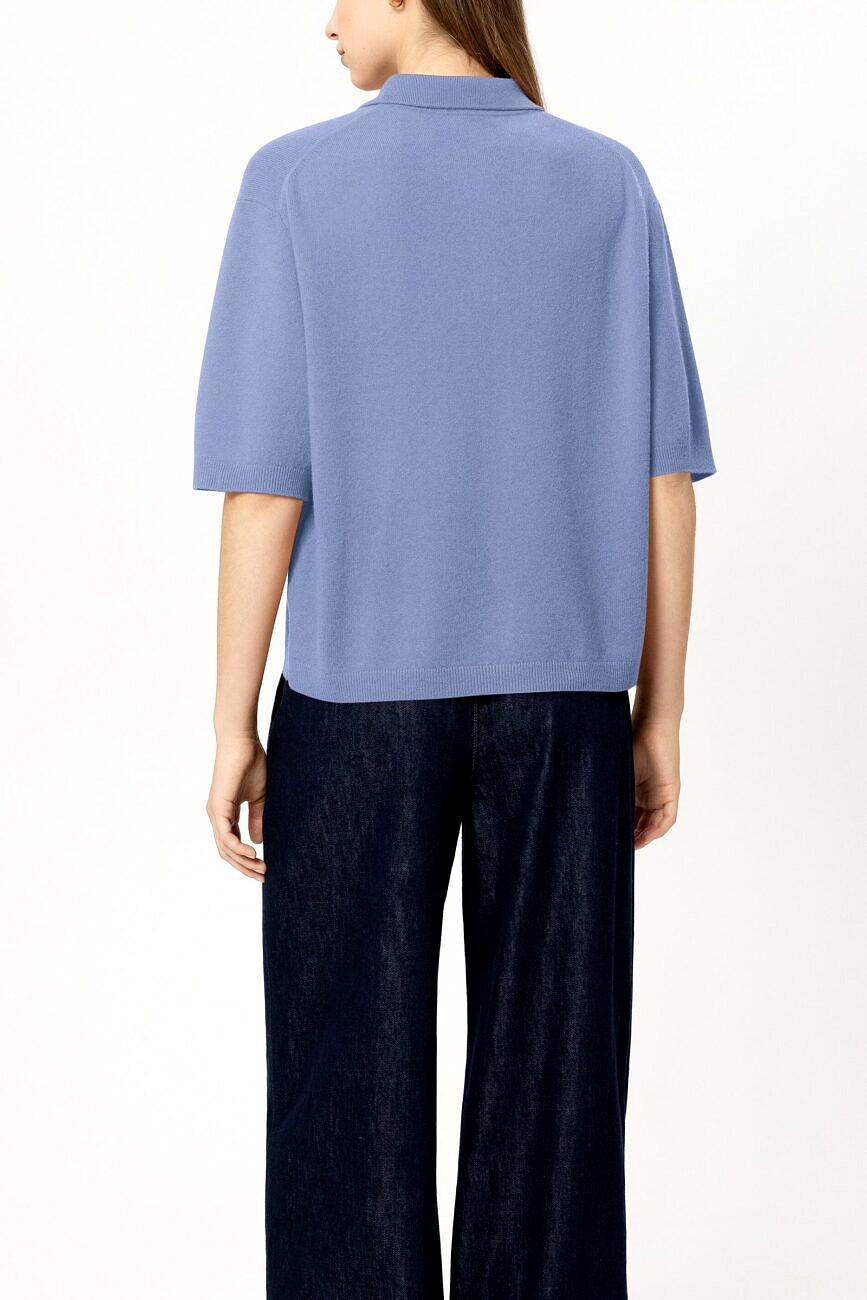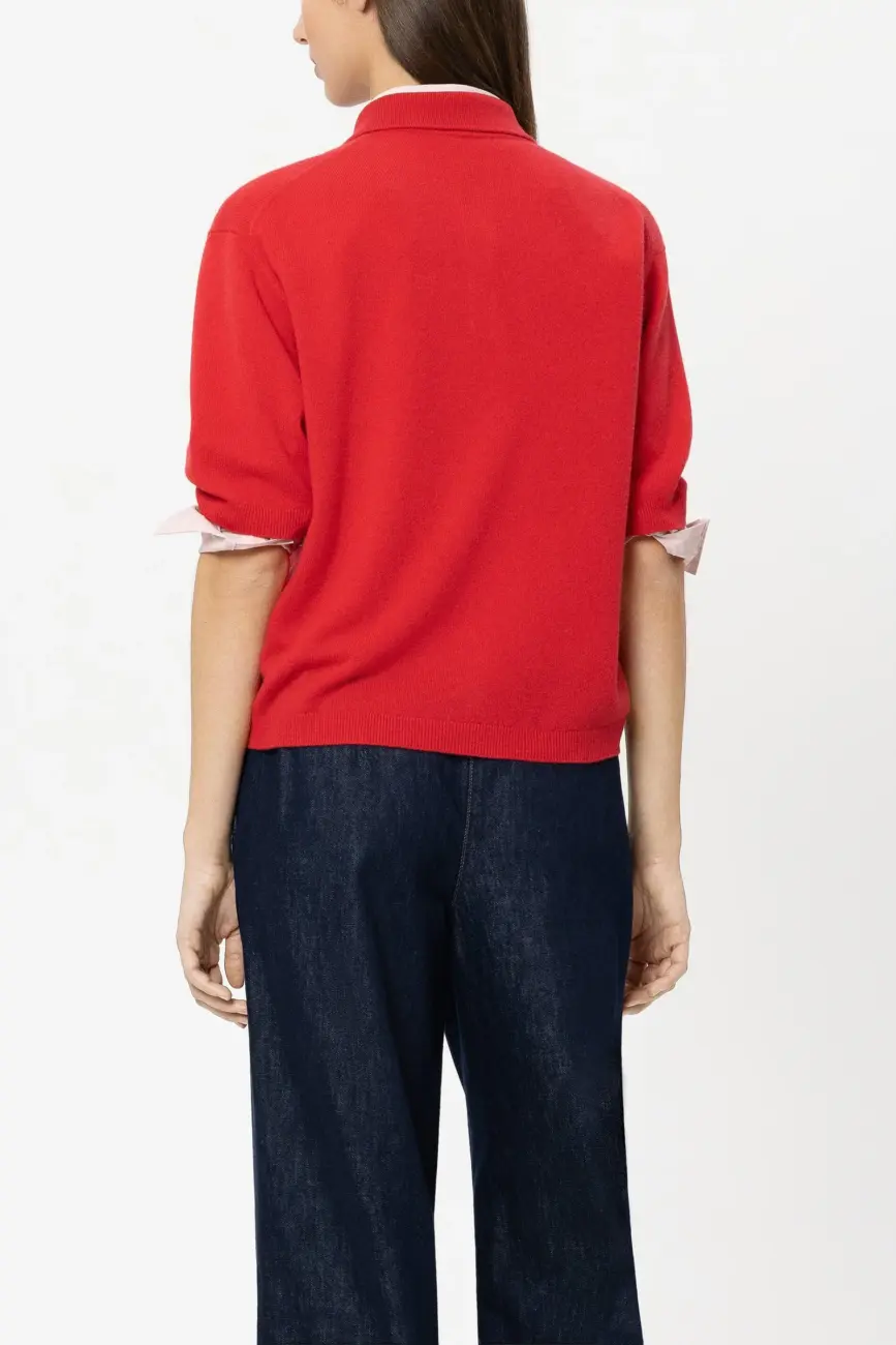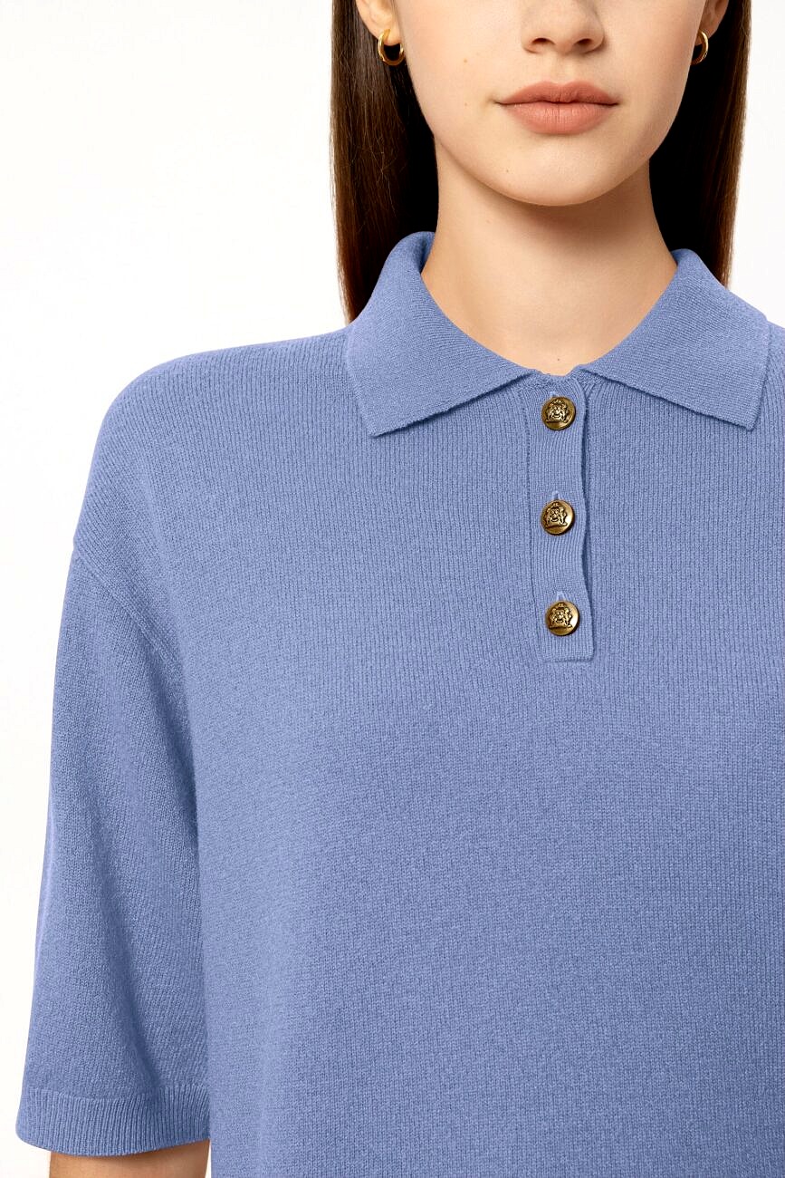 Sweter z krótkim rękawem, wykonany z eleganckiej, drobno dzianej mieszanki kaszmiru, z prążkowanym kołnierzem i opadającymi ramionami. Zapięcie na ozdobne, metalowe guziki, przyciągające wzrok.