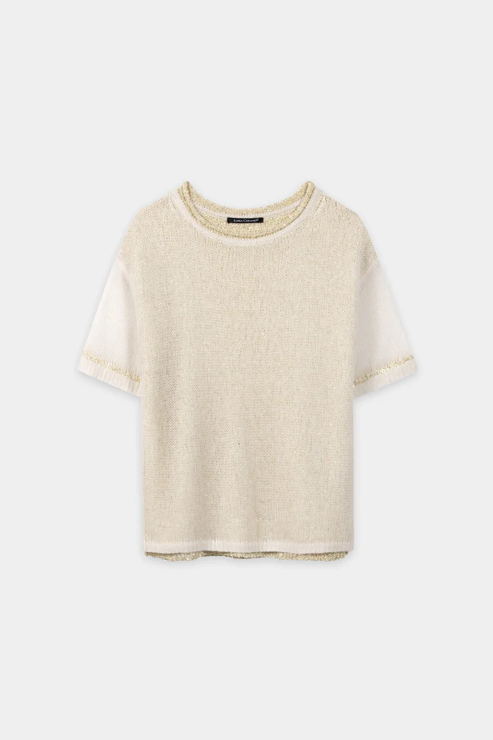 Luksusowy sweter z krótkim rękawem w dwuwarstwowej konstrukcji z okrągłym dekoltem i wywiniętym brzegiem. Przewiewna dzianina siateczkowa jest pokryta cekinowym materiałem, który elegancko się mieni.