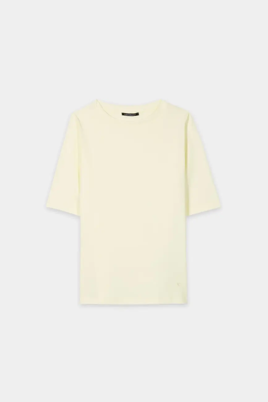 T-shirt o dopasowanym kroju z dekoltem w łódkę i rękawami o średniej długości. Rozciągliwy bawełniany materiał o delikatnej prążkowanej fakturze zapewnia wysoki poziom komfortu.