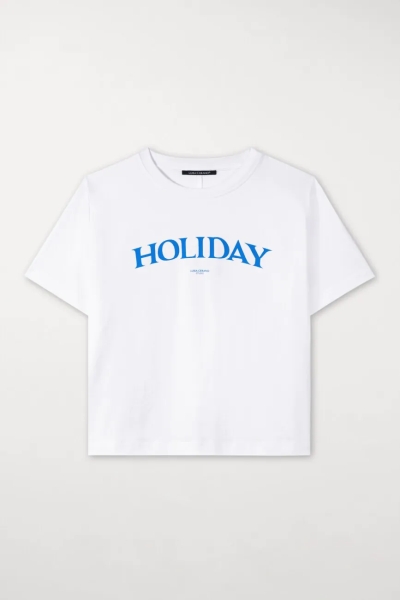 T-shirt Luisa Cerano z miękkiej bawełny organicznej o swobodnym kroju i tylnym szwie. Koszula z okrągłym dekoltem ma nadruk "Holiday" i logo z przodu.
